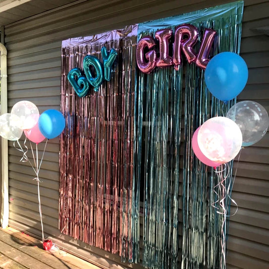 Dzimuma atklāšanas ballītes foto fons, aizkars ar bārkstīm