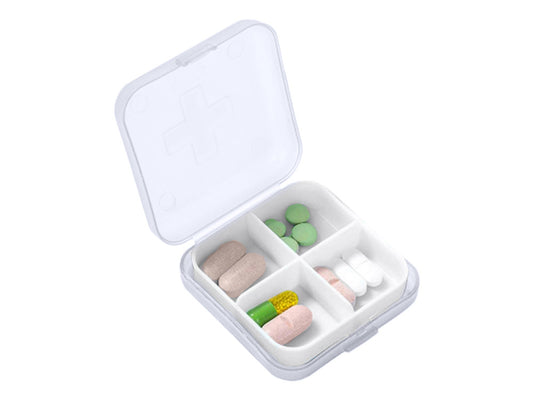 Zāļu kastītes iepakojums, uztura bagātinātāji, tabletes, ceļojumi, 4 nodalījumi
