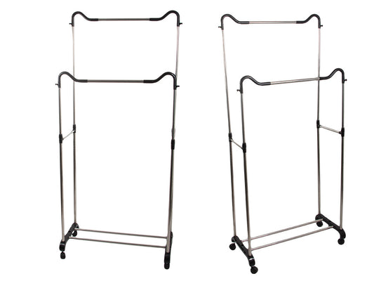 Mobilais drēbju pakaramais ar dubultiem plauktiem uz riteņiem