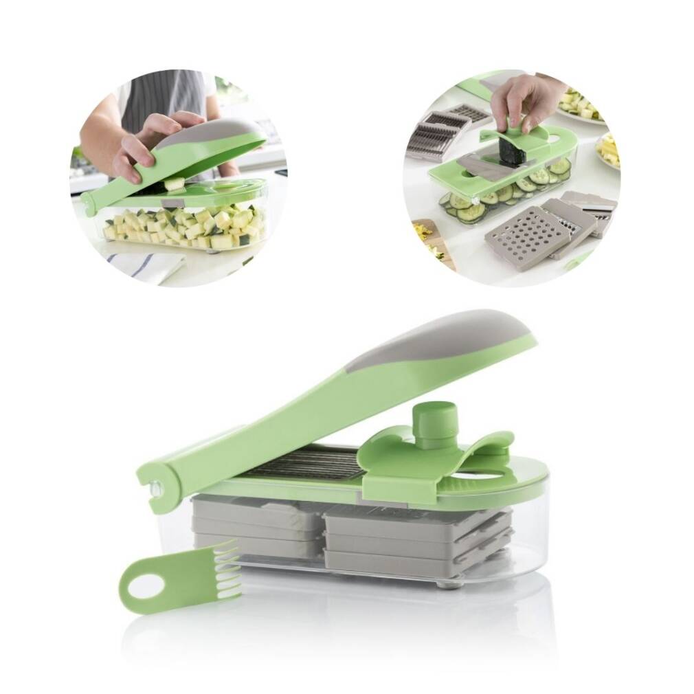 Šis ir ērts manuāls dārzeņu griezējs ar noderīgām papildierīcēm, piemēram,