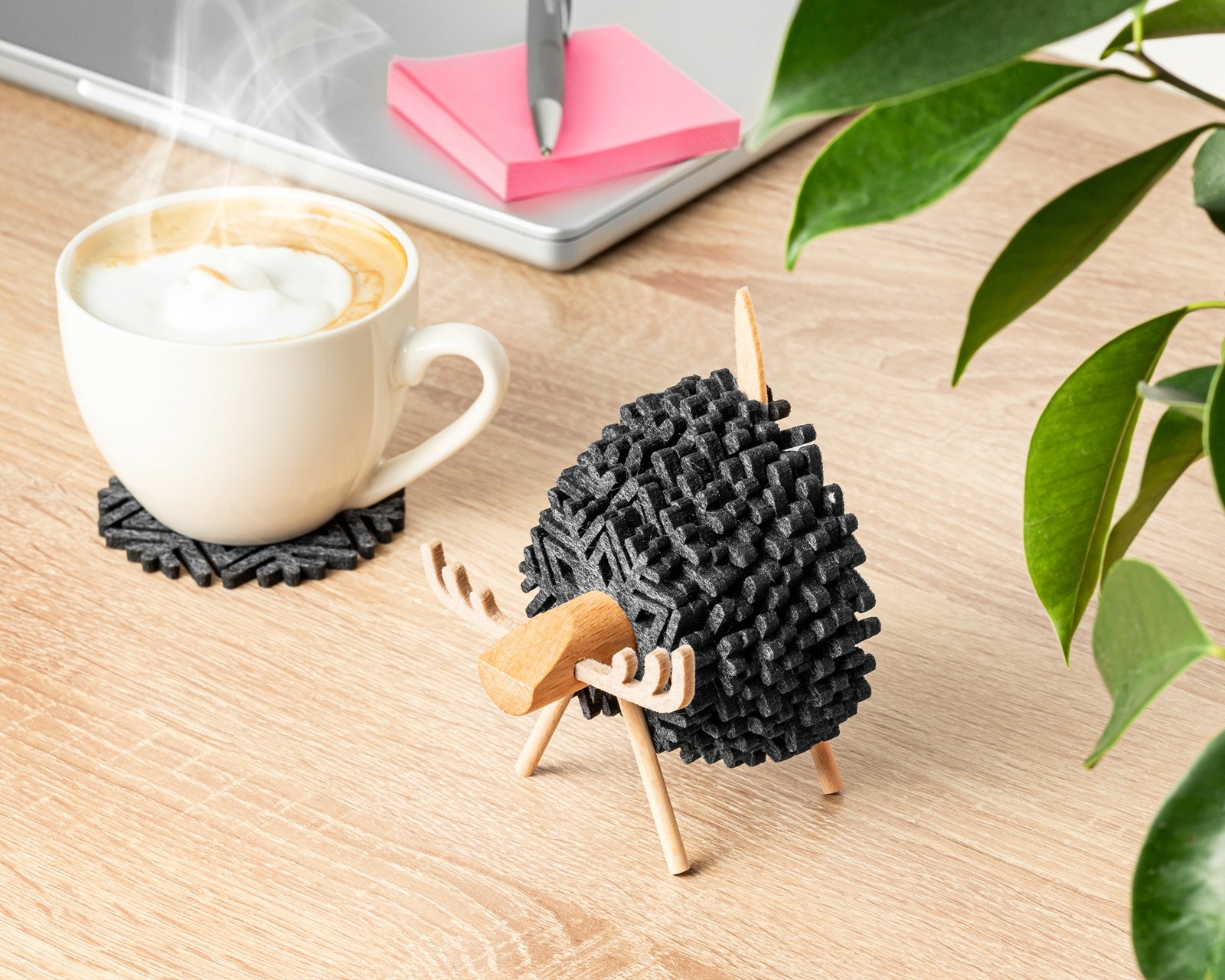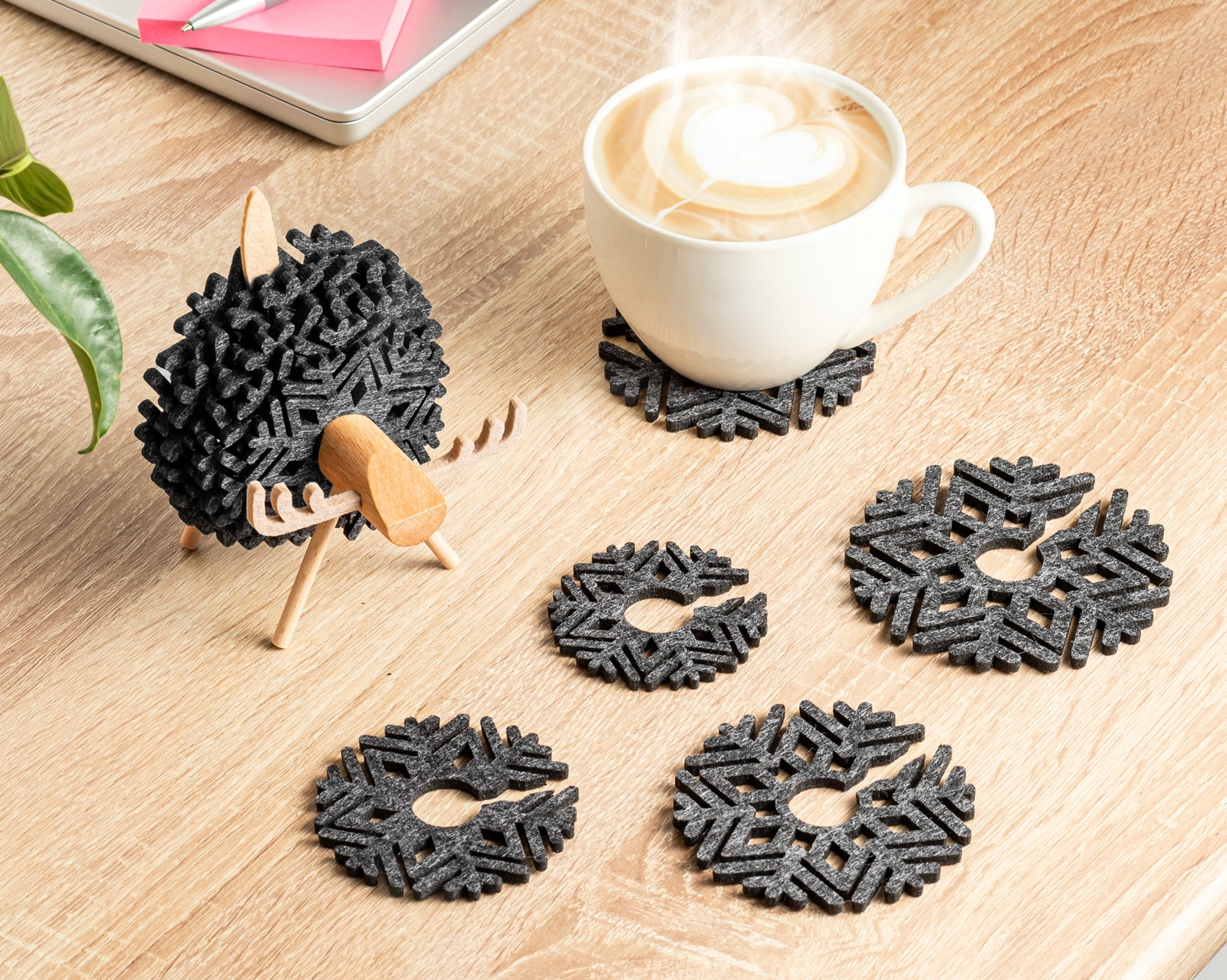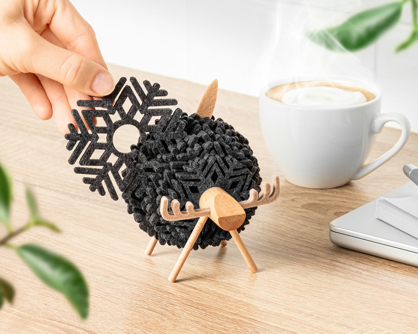 Ja jums patīk skandināvu aksesuāri un stili, šie filca paliktņi ir tieši jums. Komplektā ir divpadsmit paliktņi sniegpārslu formā, kas, novietoti uz koka statīva un papildināti ar filca ragiem un asti, rada burvīgu alņa tēlu :) Paliktņi lieliski pasargā jūsu galdus, rakstāmgaldus vai citas virsmas no karstām krūzēm vai glāzēm. Tie arī priecē aci ar savu unikālo formu. Komplektā ietilpst koka statīvs salikšanai, kā arī pamatne, četras kājas, aļņa ragi un aste. Statīvs ļauj uzglabāt paliktņus vienuviet, vienlaikus kalpojot arī kā dekoratīvs elements :) Īpašības: skandināvu stila filca paliktņi aļņa formā divpadsmit dažāda izmēra paliktņi sniegpārslu formā aizsardzība un dekorācija viena paliktņa diametrs lielākā paliktņa ir 9 cm, bet mazākā - 6 cm lieliska aizsardzība jūsu virsmām no karstām lietām un skrāpējumiem neslīdoši un viegli tīrāmi komplektā iekļauts koka statīvs praktisks, burvīgs un dekoratīvs lieliska dāvana daudziem gadījumiem paliktņu krāsa ir melna