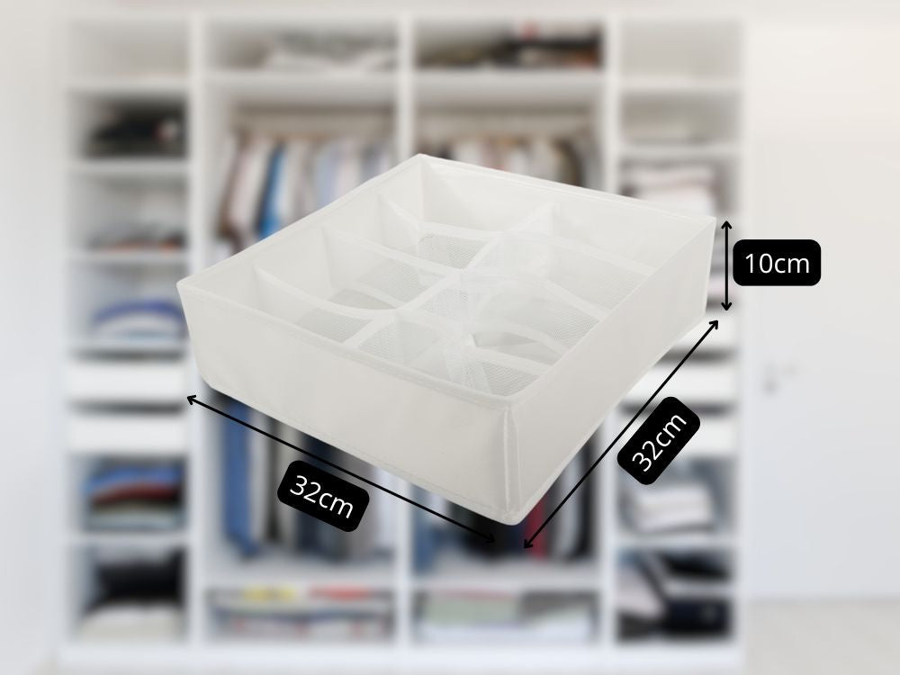 Apģērbu organizators skapja atvilktnēm ar 8 nodalījumiem 32x32x10cm? Praktisks atvilktņu organizators ar 8 nodalījumiem - balts. Šis funkcionālais organizators ir ideāls risinājums tiem, kas vēlas uzturēt kārtību savā skapī vai atvilktnē. Pateicoties tā pārdomātajam dizainam, tas ļauj efektīvi pārvaldīt telpu un viegli atdalīt mazus priekšmetus. ✨ Ideāla telpas organizācija ļauj ērti novietot apakšveļu, zeķes, kaklasaites, kosmētiku vai citus mazus aksesuārus. Atvērtais dizains ļauj viegli un ātri piekļūt saturam un uzturēt to kārtībā. Ideāli piemērots atvilktnēm, skapjiem, drēbju skapjiem vai plauktiem - palīdz ietaupīt vietu un sakārtot telpu. ? Izturīgs un viegli tīrāms, izgatavots no izturīga materiāla, izturīgs pret deformāciju un netīrumiem. Viegli tīrāms - vienkārši noslaukiet ar mitru drānu. Viegla konstrukcija padara organizatoru viegli pārvietojamu un pārkārtojamu. - Tehniskās specifikācijas: ✔ Produkta kods: ✔ Viegli tīrāms ✔ Organizatora malas pastiprinātas ar kartonu ✔ Plašs pielietojums ✔ Ir ✔ Organizatora izmēri: ✔ Materiāls: Poliesters ? Komplektā ietilpst: - organizators ar 8 nodalījumiem - Folijas iepakojums