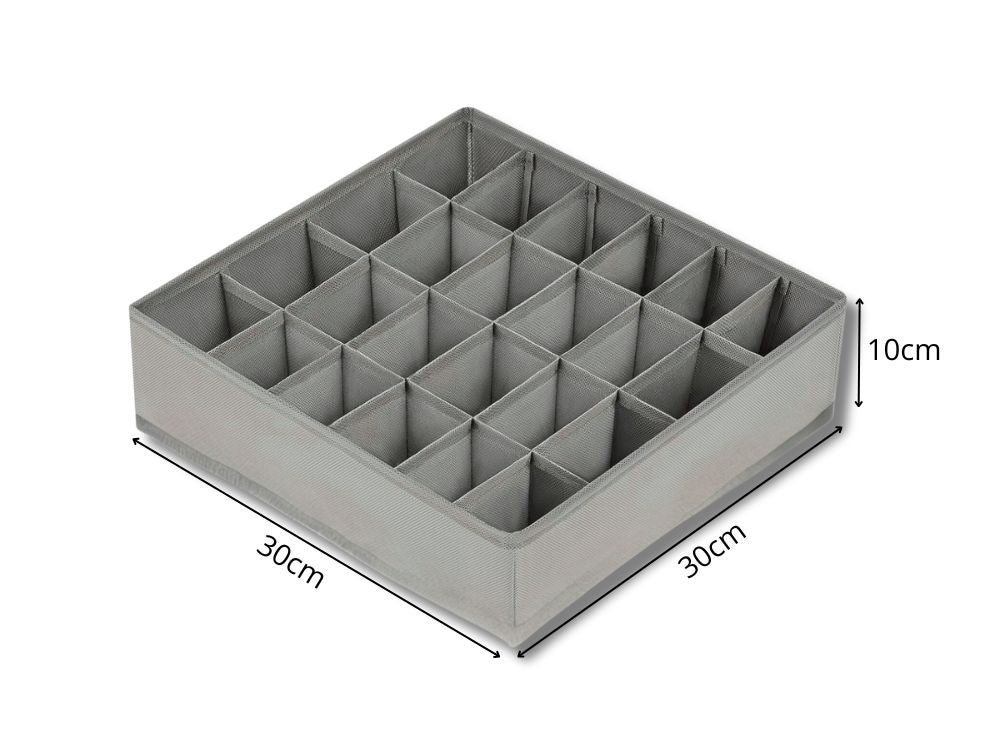 Apakšveļas organizators zeķu atvilktņu skapīša ieliktnis ar 24 nodalījumiem? Praktisks apakšveļas un zeķu organizators - 24 nodalījumi, pelēks, 30x30x10 cm. Šis funkcionālais organizators ir ideāls risinājums tiem, kas vēlas uzturēt kārtību savā garderobē. Ar izmēriem tas ir lieliski piemērots apakšveļas, zeķu, kaklasaišu un citu mazu aksesuāru glabāšanai, palīdzot maksimāli izmantot vietu atvilktnēs un skapjos.? Ideāla telpas organizācija. Organizators ir izstrādāts, domājot par efektīvu telpas pārvaldību. Ļauj atdalīt dažādus apģērba gabalus, atvieglojot nepieciešamo lietu ātru atrašanu un kārtības uzturēšanu. Ideāli piemērots lietošanai atvilktnēs, plauktos vai skapjos labākai organizācijai un estētiski pievilcīgai uzglabāšanai. ✨ Izturīgs un estētiski pievilcīgs dizains. Izgatavots no augstas kvalitātes materiāla, organizators ir izturīgs un viegli tīrāms. Tā pelēkā krāsa piešķir eleganci un iederas lielākajā daļā interjeru, piešķirot jūsu garderobei modernu pieskārienu.? Viegli lietojams, pateicoties tā pārdomātajam dizainam, organizators ir viegls un viegli pārnēsājams. To var ērti ievietot dažādās telpās, un tā kompaktais izmērs nozīmē, ka tas iederēsies lielākajā daļā standarta atvilktņu un plauktu. Kad tas nav nepieciešams, to var salocīt plakani, lai ietaupītu vietu. - tehniskās specifikācijas: ✔ produkta kods: ✔ viegli tīrāms ✔ organizatora malas pastiprinātas ar kartonu ✔ plašs pielietojuma klāsts ✔ ir ✔ organizatora izmēri: ✔ materiāls: tnt audums ? Komplektā ietilpst: - organizators 24 nodalījumi - folijas iepakojums