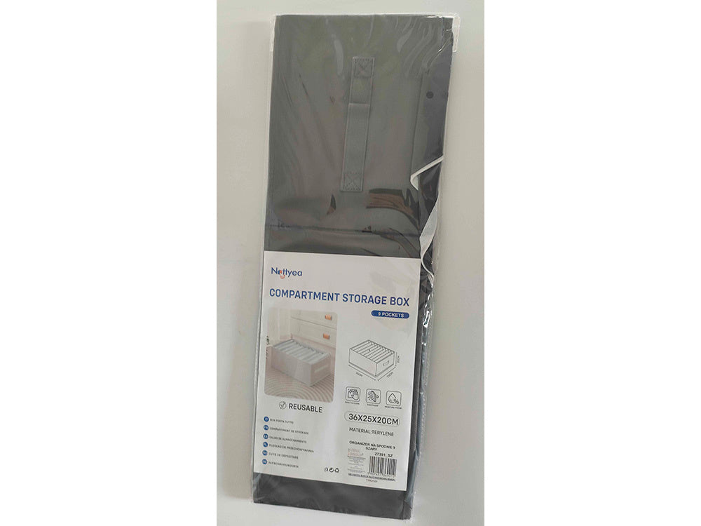 Apģērbu organizators apakšveļai, biksēm, skapim, zeķēm, pelēks 36x25x20cm? Praktisks organizators biksēm un krekliem atvilktnēm vai skapjiem - pelēks, 36x25x20 cm? Šis funkcionālais organizators ir ideāls risinājums tiem, kas vēlas uzturēt kārtību savā garderobē. Ar izmēriem , tas ir lieliski piemērots bikšu, kreklu un citu apģērba gabalu glabāšanai, palīdzot maksimāli izmantot vietu atvilktnēs un skapjos.? Ideāla telpas organizācija Organizators ir izstrādāts, domājot par efektīvu telpas pārvaldību. Tas ļauj jums atdalīt apģērbu, atvieglojot nepieciešamo lietu ātru atrašanu un kārtības uzturēšanu garderobē. Tas ir ideāli piemērots lietošanai atvilktnēs, plauktos vai skapjos, nodrošinot labāku organizāciju un estētisku uzglabāšanu.? Funkcionāls dizains Pateicoties tā pārdomātajam dizainam, organizatoru ir viegli lietot un to var viegli pielāgot dažādām telpām. Tā vieglā konstrukcija ļauj to viegli pārvietot un pārkārtot pēc nepieciešamības. Tas ir neaizstājams aprīkojums ikvienam, kurš novērtē kārtību un funkcionalitāti apģērbu glabāšanā. - tehniskās specifikācijas: ✔ produkta kods: ✔ viegli tīrāms ✔ organizatora malas pastiprinātas ar kartonu ✔ plašs pielietojuma klāsts ✔ ir ✔ organizatora izmēri: ✔ materiāls: poliesters ? komplektā ietilpst: - organizators ar 9 nodalījumiem - folijas iepakojums