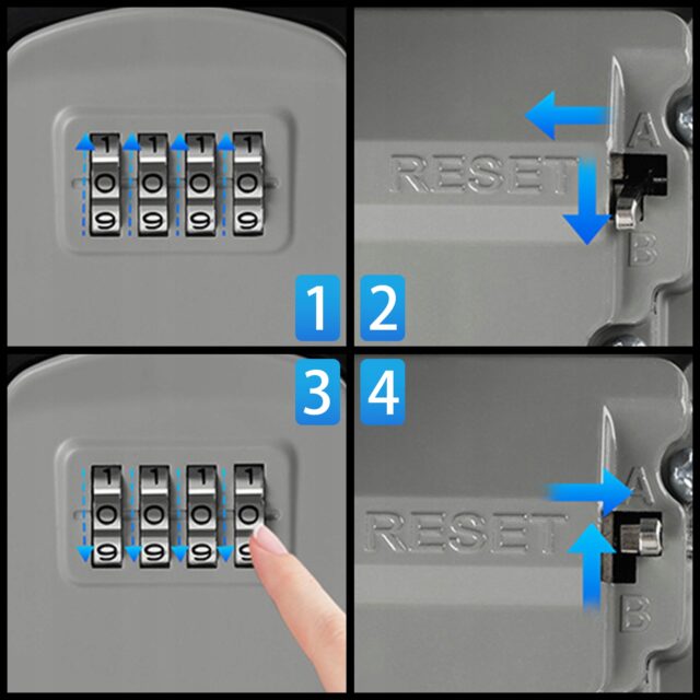 Arī kombinācijas maiņa ir vienkārša. Ievadiet pašreizējo kodu, bīdiet pogu RESET