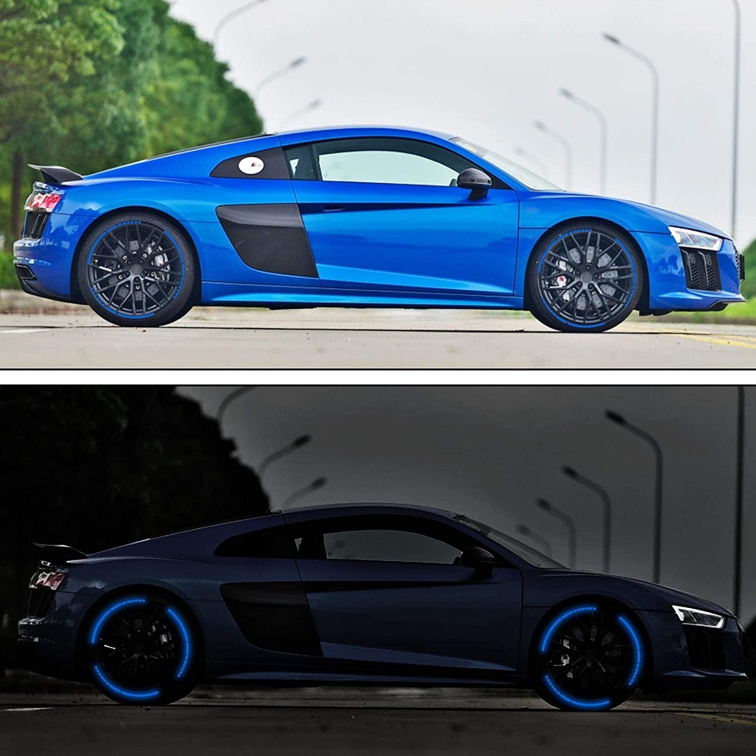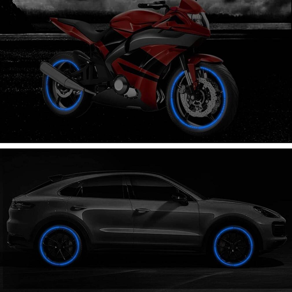 Atstarojošas uzlīmes automašīnu vai motociklu riepām. Tie uzlabo redzamību un drošību uz ceļa, radot pārsteidzošu efektu, īpaši naktī.