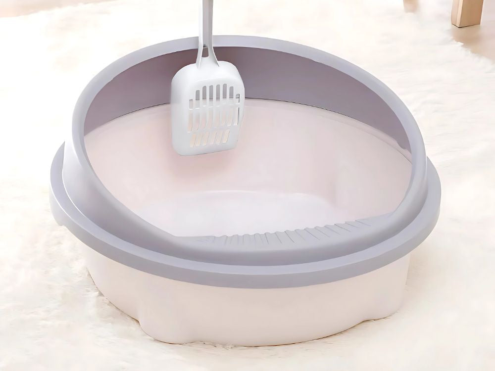 Atvērta tualetes kaste, liela, cieta, ar lāpstiņu un augstu malu