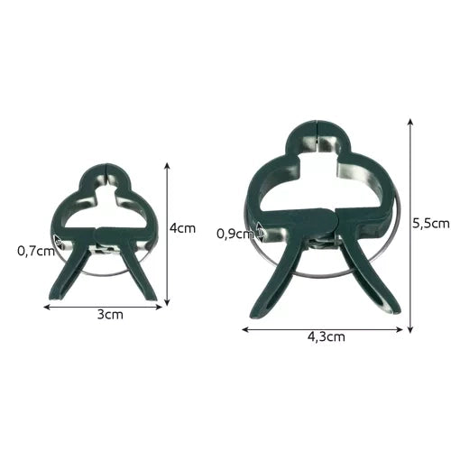 Augu saspraudes 108 gabalu liels komplekts un divi izmēri – viss komplekts ir aprīkots ar 108 saspraudēm. Klipši atbalstīs podos un dārza augus. Komplektā ietilpst divu izmēru klipši. Minimāla iejaukšanās veģetācijā – šīs saspraudes ir ļoti trauslas un praktiski neredzamas, kas minimāli ietekmē augu izskatu. Tās nebojā audus un neierobežo to augšanu. Lietošanas ērtums – sprādzes ir viegli lietojamas, nav nepieciešami īpaši instrumenti vai prasmes. Tās var izmantot gan mājas dārzos, siltumnīcās, gan telpās, kur audzē podos audzētus augus. Izturīgas pret atmosfēras apstākļiem – augu saspraudes ir izturīgas pret laikapstākļiem, tostarp lietu, mitrumu vai saules gaismu, kas padara tās izturīgas un var tikt izmantotas ilgu laiku. Specifikācija – krāsa: zaļa; materiāls: PP; citi: dzelzs + cinks; mazākās izmēri: 3 x 4 x 0,7 cm; lielākās izmēri: 4,3 x 5,5 x 0,9 cm; svars: 546 g; svars iepakojumā: 627 g. Specifikācija krāsa: zaļa materiāls: pp cita informācija: dzelzs + cinks mazāks izmērs: 3 x 4 x 0,7 cm lielākā izmēra izmēri: 4,3 x 5,5 x 0,9 cm svars: 546 g svars iepakojumā: 627 g iekļauti 54 mazāki klipši 54 lielāki klipši augu klipši, kas pazīstami arī kā augu klipši vai atbalsta klipši, ir mazi, plastmasas instrumenti, ko izmanto augu atbalstam dārzos, siltumnīcās vai telpaugiem. Tie ir klipši ar āķiem vai zariem vienā galā, ko var piestiprināt pie auga, un plakanu daļu otrā galā, kas notur augu vietā.