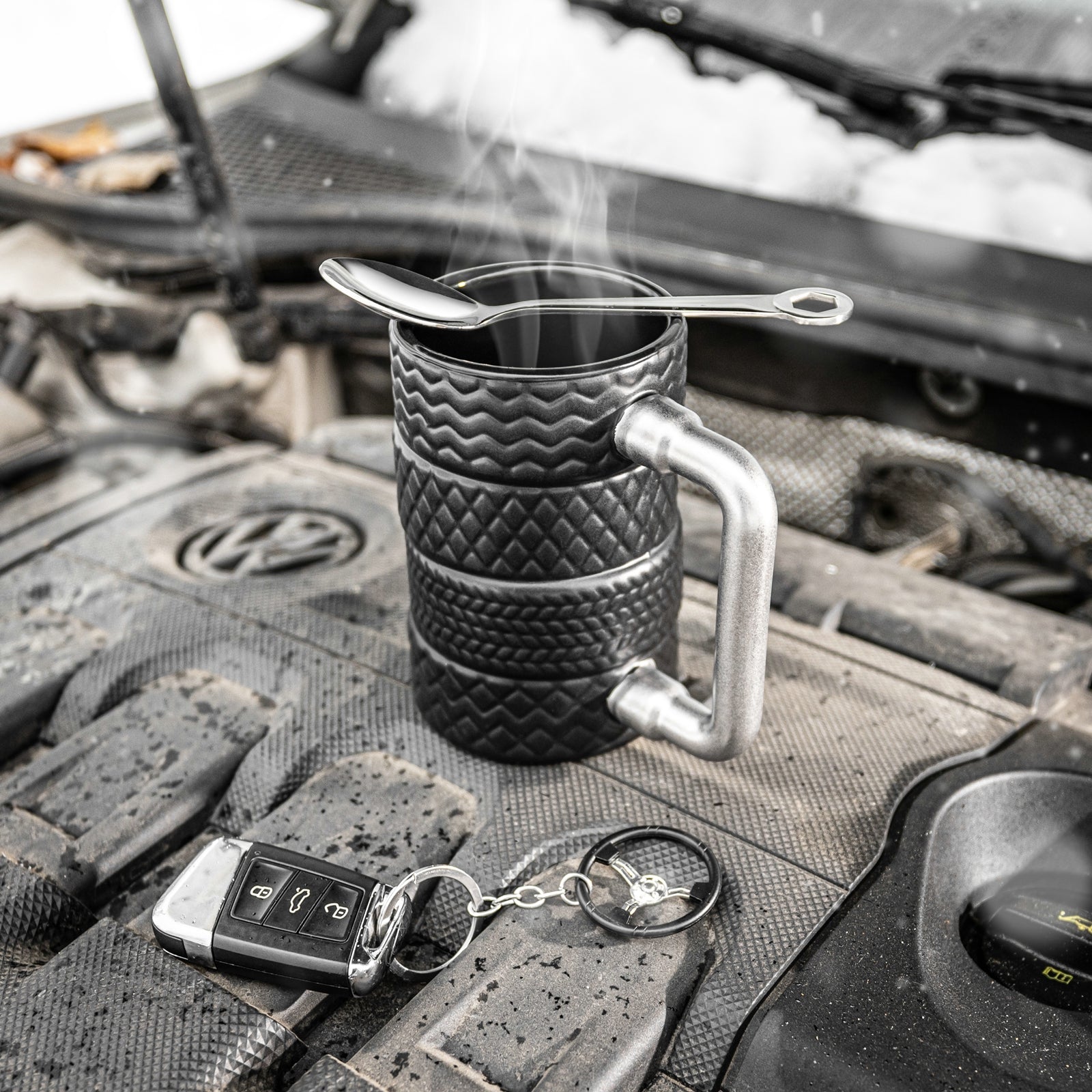 Vīriešu dāvanu komplekts - riepu krūze, uzgriežņu atslēgas karote un riteņu atslēgu piekariņš
