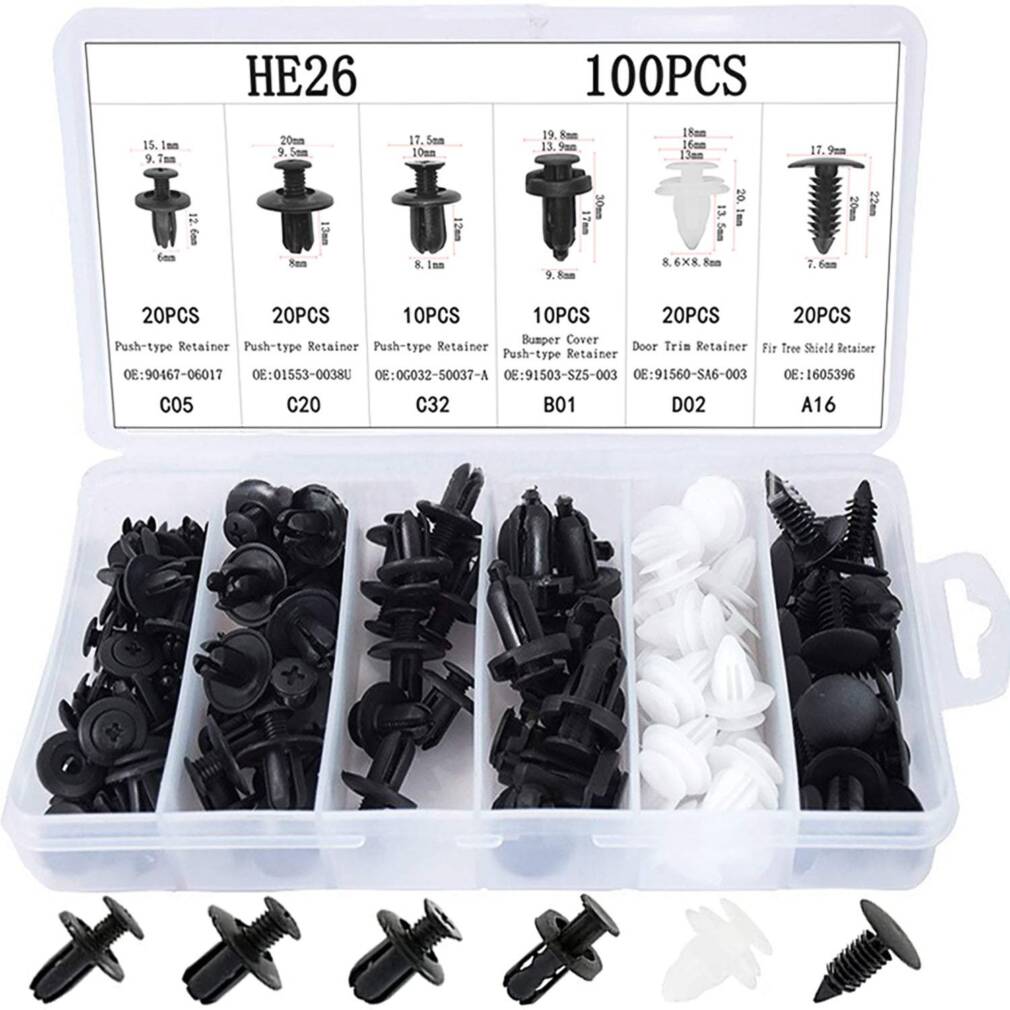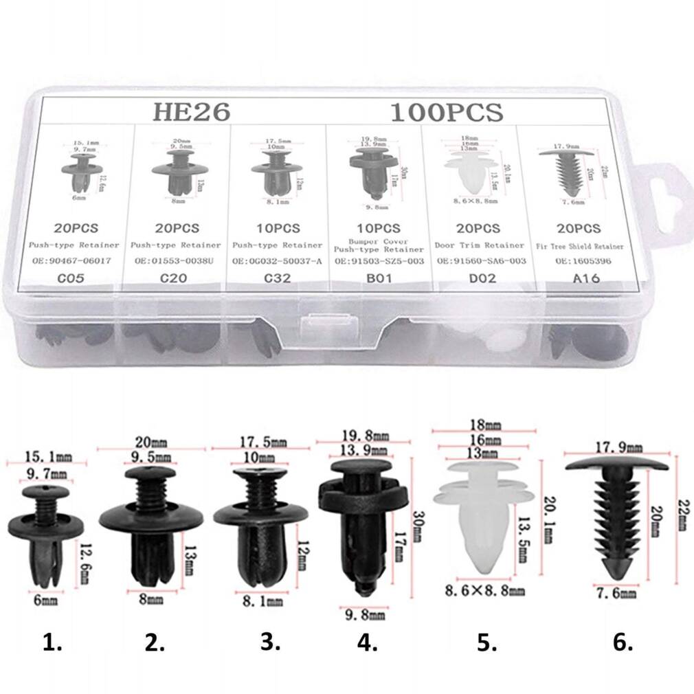 Ar 100 gabaliem vienā komplektā jums būs daudz klipšu, ko izmantot buferiem, riteņu arkām, pārvalkiem, polsterējumam, atzveltnes krēsliem un sēdekļiem, polsterējumam, kapuces stiprinājumiem, durvju paneļiem, vārpstas klipšiem un citiem. Un ar atsevišķiem saišu veidiem, piemēram, OE:90467-06017, OE:01553-0038U, OE:0G032-50037-A, OE:91503-SZ5-003, OE:91560-SA6-003 un OE:1605396, katram darbam ir ideāls klips.