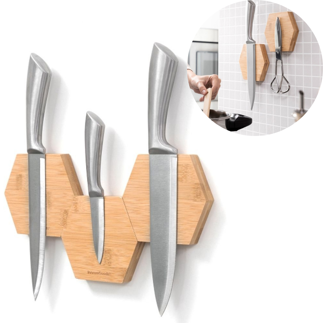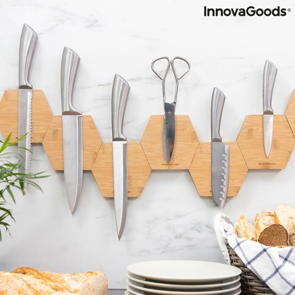 Trīs magnētisku bambusa nažu turētāju komplekts. Galvenokārt tie izmantojami virtuvē kā turētāji visu veidu nažiem, bet tos var izmantot kā turētājus arī citiem metāla priekšmetiem, piemēram, šķērēm un atslēgām. Modernais un oriģinālais turētāju dizains padara tos ļoti daudzpusīgus un pielāgojamus. Turētājus var novietot dažādās pozīcijās, kopā vai atsevišķi. Tajos izmantota izturīga abpusēja līme, kas nodrošina to optimālu piestiprināšanu un vieglu uzstādīšanu bez nepieciešamības pēc īpašas montāžas vai instrumentiem. Virsmai, uz kuru uzstāda turētāju, jābūt gludai (ne porainai) un pēc pielīmēšanas turētājus nevar noņemt un pārvietot uz citu virsmu. Turētājos iebūvētajiem magnētiem ir augsts magnētiskais spēks, kas nodrošina metāla priekšmetu stingru turēšanu. Šie daudzfunkcionālie turētāji ir ļoti ērti, viegli lietojami un tīrāmi. Tie ir kompakti un viegli, un ļauj maksimāli izmantot pieejamās telpas priekšrocības, palīdzot uzturēt lietas kārtībā un sakārtotas.
