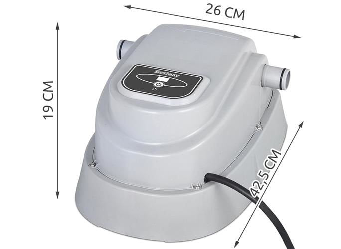 Baseina ūdens sildītājs ar augstu sildīšanas jaudu – ļauj ātri uzsildīt ūdeni līdz optimālai 20 °C temperatūrai. Pārkaršanas aizsardzība – ūdens plūsmas sensors aizsargā ierīci no bojājumiem. Specifikācija – izmēri (l): 42,569 cm; iepakojuma izmēri (l) 4894,5 cm; svars 5,1 kg; jauda 2800 W (pie 20 °C). Vienkārša uzstādīšana – vienkārša konstrukcija un nesarežģīts darbības princips ļauj sildītāju ātri pieslēgt baseina filtra sūknim. Digitālā vadība – ierīce ir aprīkota ar precīzu temperatūras kontroles sistēmu. Specifikācija Bestway produkta kods: 58259 barošanas avots: 220-240v ~50hz jauda: 2800w (pie 20°C) maksimālā temperatūra: 40°C ietilpība: līdz 3785l ieteicamais ūdens daudzums: 1520-17035l izmēri (garums/augstums): 42,569cm iepakojuma izmēri (garums/augstums): 4894,5cm kabeļa garums: 350cm svars: 5,1kg ūdens uzsildīšana baseinā ne tikai nodrošina vispārēju tā lietošanas komfortu, bet arī ļauj ātrāk izbaudīt spēlēšanās vai atpūtas prieku ūdenī pēc baseina piepildīšanas, tas arī ļaus peldēties baseinā aukstākās dienās, kad ūdens nevar pietiekami uzsilt saules un apkārtējās vides temperatūras dēļ, ūdens sildītāja izmantošana ļauj relatīvi ātri paaugstināt ūdens temperatūru līdz optimālajam 20°C līmenim. Ierīce ir pielāgota darbam kopā ar filtra sūkņiem ar jaudu līdz 3785. Vienkāršā konstrukcija un nesarežģītais darbības princips nozīmē, ka sildītāju var ātri pieslēgt baseinu apkalpojošajai filtra sistēmai. Ierīce efektīvi darbojas baseinos ar ietilpību no 1520 l līdz 17035 l. Ūdens uzsildīšanas laiks un maksimālā sasniedzamā temperatūra ir atkarīga no sākotnējās ūdens temperatūras un apkārtējās vides temperatūras. Lietotāju drošību nodrošina sildītājā esošais diferenciālais slēdzis, kas izslēdz strāvu, ja tiek konstatētas jebkādas ierīces darbības neatbilstības. Šis risinājums nodrošina aizsardzību pret elektriskās strāvas triecieniem un ir nepieciešams, ja elektriskās ierīces darbojas tiešā saskarē ar cilvēkiem. Ierīce reaģē uz strāvas plūsmas izmaiņām ar starpību 10 mA, kas ir galējā vērtība, kas garantē lietotāja drošību. Ražotājs: Bestway Inflatables and Material Corp. nr. Džinjuaņvuas ceļš 208, Šanhaja, 201812, Ķīna, tālr. 86 21 69135588, info@bestwaycorp.com. Atbildīgā persona ES: Bestway Europe Spa, Via Resistenza, 5, 20098, San Giuliano, Milāna (MI), PVN reģ.nr.: IT 02561670130. Kontaktinformācija: e-pasts: compliance@bestwaycorp.eu. Atbildīgā persona: Laura Di Dio, l.didio@bestwaycorp.eu. Brīdinājums. Saturs: Brīdinājums! Lūdzu, uzmanīgi izlasiet šos norādījumus un saglabājiet tos turpmākai uzziņai.