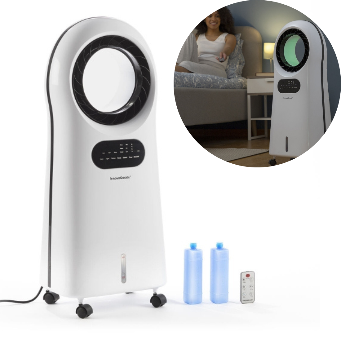 Tam ir 360º difuzors, skārienvadības panelis, tālvadības pults, taimeris (līdz 8 stundām), 3 ātrumi (zems / vidējs / augsts) un 3 ventilācijas režīmi: normāls (nepārtraukts gaiss), dabisks (dabisks vējš) un nakts (maiga vējš). Automātisko izslēgšanos var iestatīt pēc 1-8 stundu ilgam laika periodam. Papildus tam ir arī 6 krāsu LED apgaismojums, kas piešķir tā dizainam modernu un elegantu izskatu, radot relaksējošāku un patīkamāku atmosfēru. Iekšējās tvertnes tilpums ir 3 litri, un, tāpat kā filtru, to var noņemt un iztīrīt. Tas ietver arī aukstuma glabāšanas vienības: 2 noņemamas ledus uzglabāšanas tvertnes, kuras palīdz uzturēt vēsu efektu. Ierīces 4 riteņi padara to viegli pārvietojamu no vienas vietas uz otru. Iztīrīs gaisu apmēram 20 m² diapazonā ap sevi. Tā jauda ir 110W un tam ir zems enerģijas patēriņš.