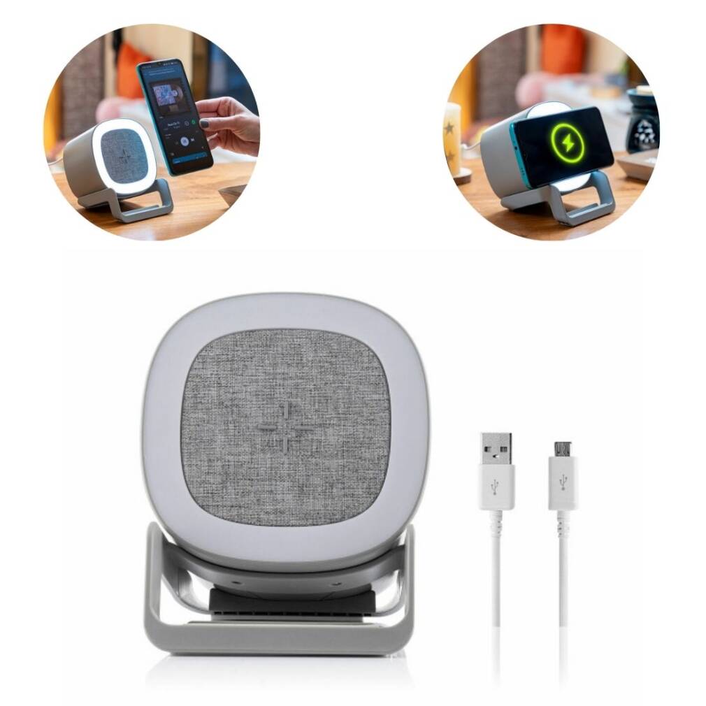 Šis ir daudzfunkcionāls bezvadu skaļruņu lādētājs ar LED gaismu. Uzlādējiet