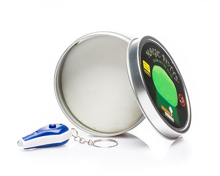 Viss, ko mēs zinām, domāšanas tepe un daudzas tās versijas. Tagad jūs varat izklaidēties ar spīdumu tumsā tepe ar iekļautu UV gaismu. Tas turpina jautrību pat tad, ja apgaismojums ir izslēgts. Šī fosforescējošā tepe izstaro zaļu mirdzumu, kas noteikti aizraus bērnus. Tam ir arī visas parastās, jautrās oriģinālās domāšanas špakteles īpašības. Tātad tas nozīmē, ka varat to atlēkt, izstiepties, saplēst, pilēt, salauzt vai pat sadragāt. Tas ir uz silikona bāzes, tie nekad neizžūs. Protams, ar šo tumsā mirdzošo špakteli var rakstīt vai zīmēt jebkādus rakstus ar UV gaismu un izklaidēties tumsā. Tas nav toksisks un netīra. Īpašības: - burvju špakteles mirdzums tumsā - UV gaisma iekļauta - metāla kastē (dia. 8 cm) - špakteles krāsa: balta - mirdzuma krāsa: zaļa - svars 50 g - lielisks radoša dāvana ne tikai bērniem - pieejama arī: burvju magnētiskā tepe ar magnētu un šķidro stiklu
