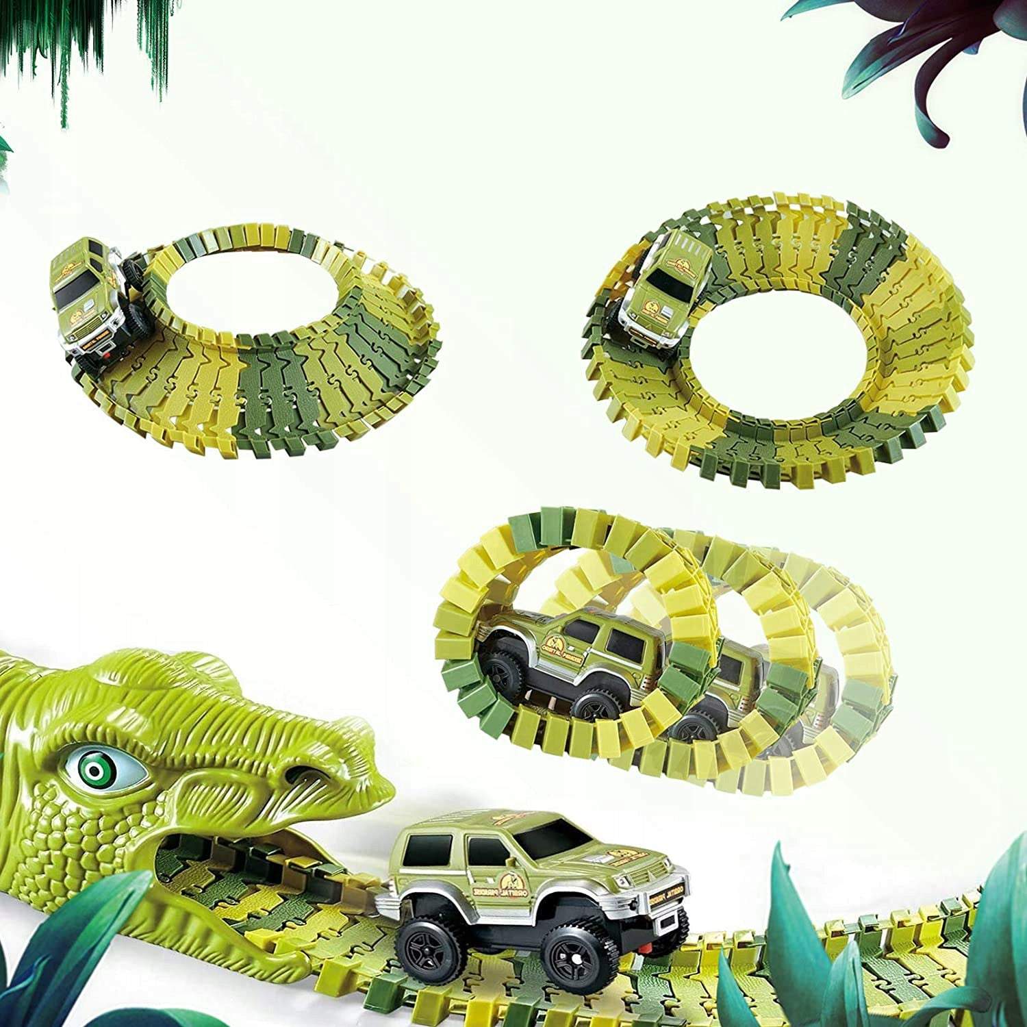 Dinozauru sacīkšu trases komplekts piedāvā episku piedzīvojumu bērniem, piedāvājot 271 elementu, no kuriem izvēlēties, tostarp 4 palmas, 2 dinozauru galvas tuneļus, 8 tilta laidumus, 4 laidumu savienotājus, 2 pārnesumus un 240 trases. Komplektā ietilpst arī ar akumulatoru darbināma automašīna, kas zibens ātrumā var tuvināt trasi, taču uzmanieties no 8 dinozauru figūrām, kas varētu mēģināt uzbrukt automašīnai. Ar bezgalīgām iespējām komplektu var veidot kā gludu un vienkāršu sacīkšu trasi vai sarežģītu bezceļu trasi ar tiltiem un tuneļu šķērsojumiem.