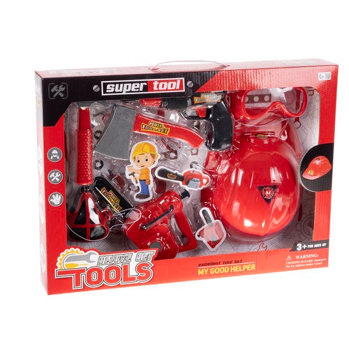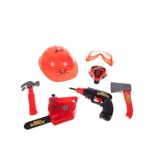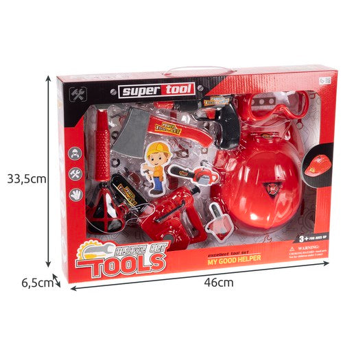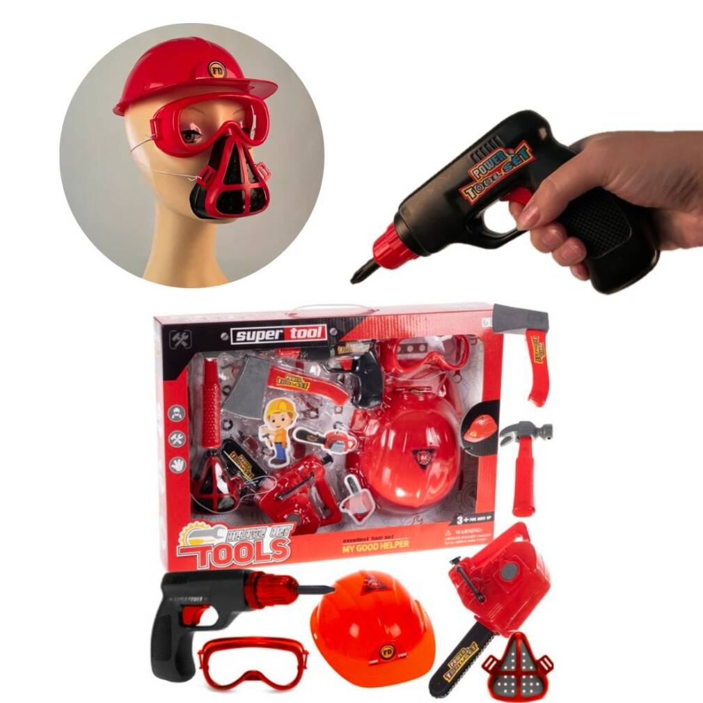 tā uzreiz apstājas. Komplektā ietilpst arī rotaļu cirvis, āmurs un skrūvgriezis