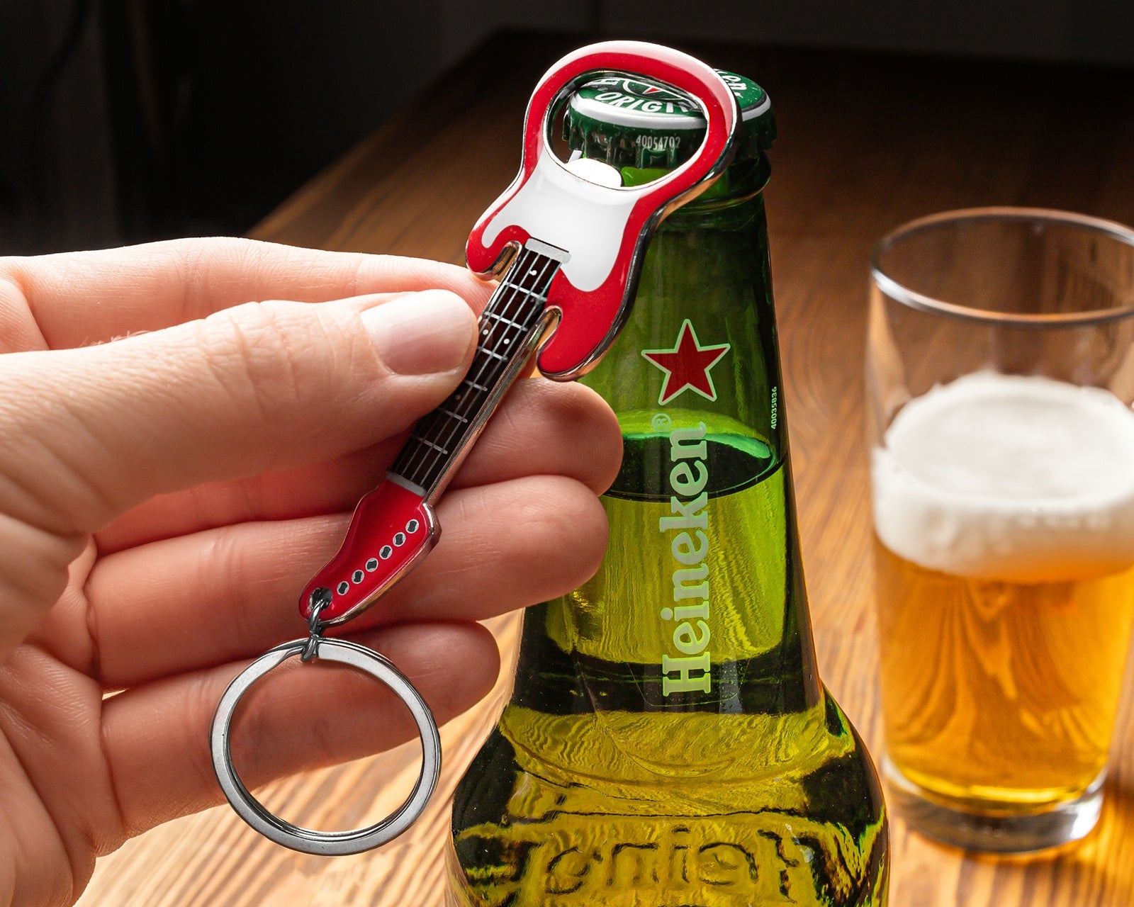 Elektriskās ģitāras formas pudeļu attaisāmais ar atslēgu piekariņu un magnētu – ideāli piemērots visiem patīkamu skaņu cienītājiem, tostarp skaņas, kas rodas, atverot iecienītāko dzērienu! Piešķiriet savai ikdienas dzīvei roka stila pieskārienu ar mūsu unikālo elektriskās ģitāras formas pudeļu attaisāmo. Šī daudzfunkcionālā ierīce ir ne tikai praktisks instruments, bet arī stilīgs aksesuārs, kas iepriecinās jebkuru mūzikas mīļotāju. Produkta priekšrocības: unikāls dizains: attaisāmais ir veidots miniatūras elektriskās ģitāras formā ar reālistiskām detaļām, padarot to par ideālu dāvanu roka un mūzikas faniem. atslēgu piekariņa funkcija: aprīkots ar metāla gredzenu, attaisāmo var viegli piestiprināt pie atslēgām, mugursomas vai somas, nodrošinot, ka tas vienmēr ir pa rokai. magnēts aizmugurē: ar iebūvētu magnētu attaisāmo var viegli piestiprināt pie ledusskapja vai jebkuras citas metāla virsmas, noturot to vietā un gatavu lietošanai. augstas kvalitātes konstrukcija: izgatavots no izturīga metāla, šis attaisāmais garantē ilgstošu lietošanu un izturību pret bojājumiem. kompakts izmērs: tā mazie izmēri padara to vieglu un ērtu, ideāli piemērotu ikdienas nēsāšanai. Šis elektriskās ģitāras formas pudeļu attaisāmais ir ne tikai praktisks sīkrīks, bet arī stilīgs aksesuārs, kas piešķir raksturu jebkurai virtuvei vai jūsu atslēgu piekariņam. Padariet pudeļu atvēršanu vēl patīkamāku, gluži kā mūziku jūsu ausīm ;) Īpašības: ērts metāla pudeļu attaisāmais elektriskās ģitāras formā dažiem pudeles atvēršanas skaņa ir vislabākā mūzika ;) Stilīgs un praktisks aksesuārs ar metāla atslēgu piekariņu piestiprināšanai pie atslēgām vai mugursomas magnētu aizmugurē piestiprināšanai pie ledusskapja vai jebkuras citas metāla virsmas. Iepakots melnā, stilīgā dāvanu kastītē. Krāsa: sarkana. Pieejams arī melna. Attaisāmā izmēri: 11 x 3,2 x 0,3 cm. Forša un unikāla dāvana ne tikai labas mūzikas un dzērienu cienītājiem, piemērota dažādiem gadījumiem.