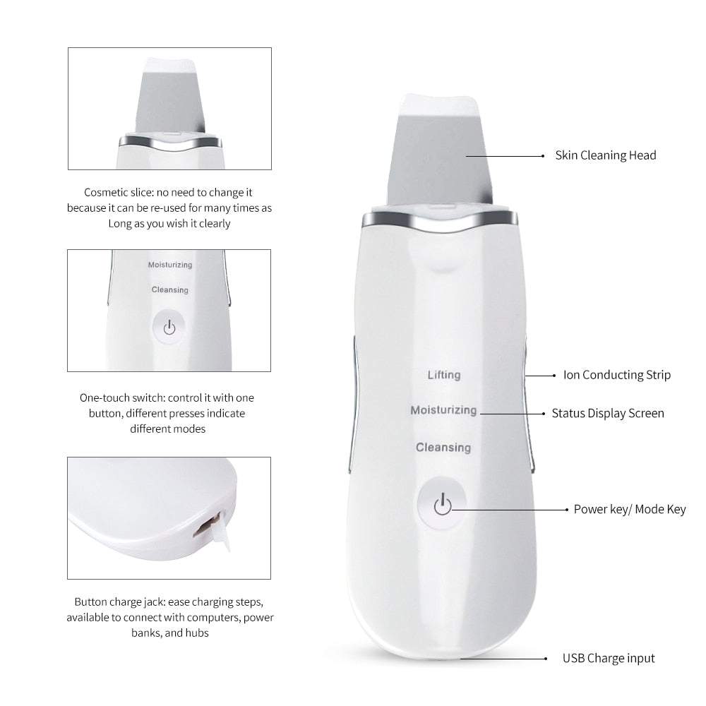 Skruberis darbojas ar ultraskaņas vibrāciju (24000Hz / sek), kas ieiet dziļi porās notīrot netīrumus un atmirušās šūnas. Tas efektīvi noņem pūtītes, melnos komedonus, likvidē grumbas un uzlabo asinsriti, kā arī veicina vielmaiņu.