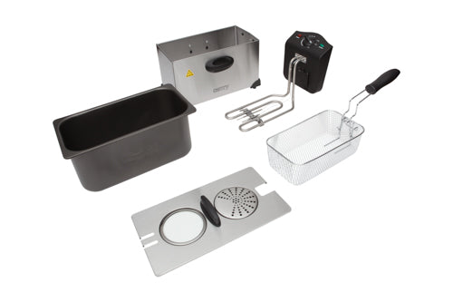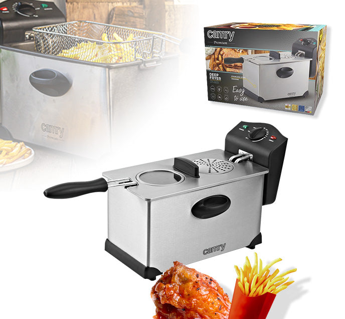 Izturīga cepeškrāsns kartupeļu gardumu pagatavošanai visai ģimenei. Tvertnē ir 3 litri, un pašai ierīcei ir jaudīga 2000 vati. Friteris ir droši lietojams un tajā pašā laikā viegli tīrāms un glabājams. To cita starpā nodrošina noņemama eļļas tvertne, efektīvais vākā iebūvēts filtrs, grozs ar pacelšanas funkciju un nesildošs rokturis tā noņemšanai. CR 4909 cepšanas iekārta ir aprīkota arī ar pārkaršanas aizsardzības sistēmu. PRODUKTA SPECIFIKĀCIJAS: Noņemama eļļas tvertne Tilpums: 3l Temperatūras kontrole Filtrs vākā Indikatora gaisma Grozs ar pacelšanas funkciju Noņemams sildītājs Jauda: 2000W Dziļums ar rokturi: 58 cm Dziļums bez roktura: 45 cm Platums: 22 Cm Aizmugurējais augstums: 26,5 cm Augstums priekšā: 26,5 cm 18 cm Korpusa materiāls: Metāls Korpusa krāsa: Sudraba Strāvas vads krāsa: Melna Strāvas vada garums: 101 cm Spraudņa veids: E/F