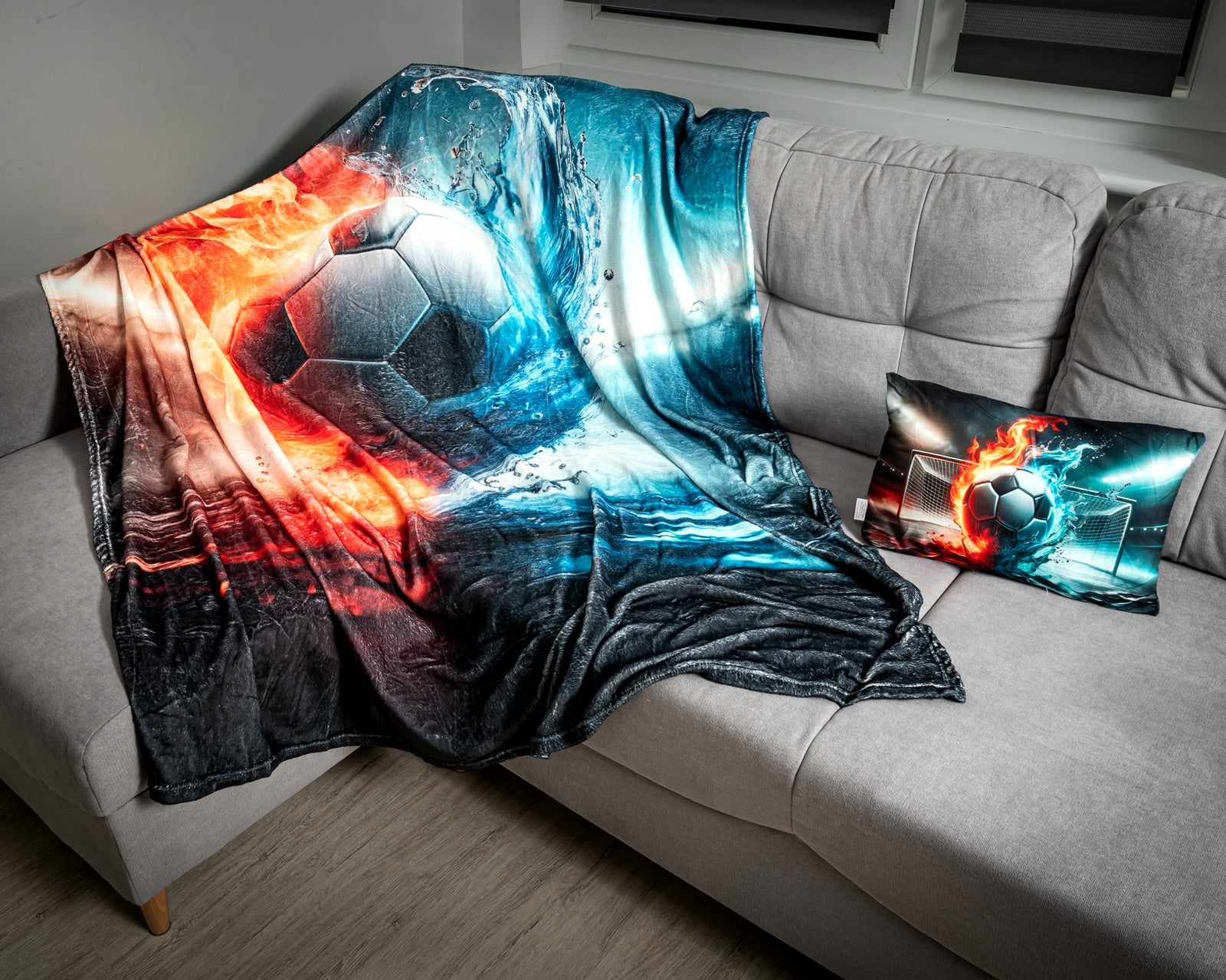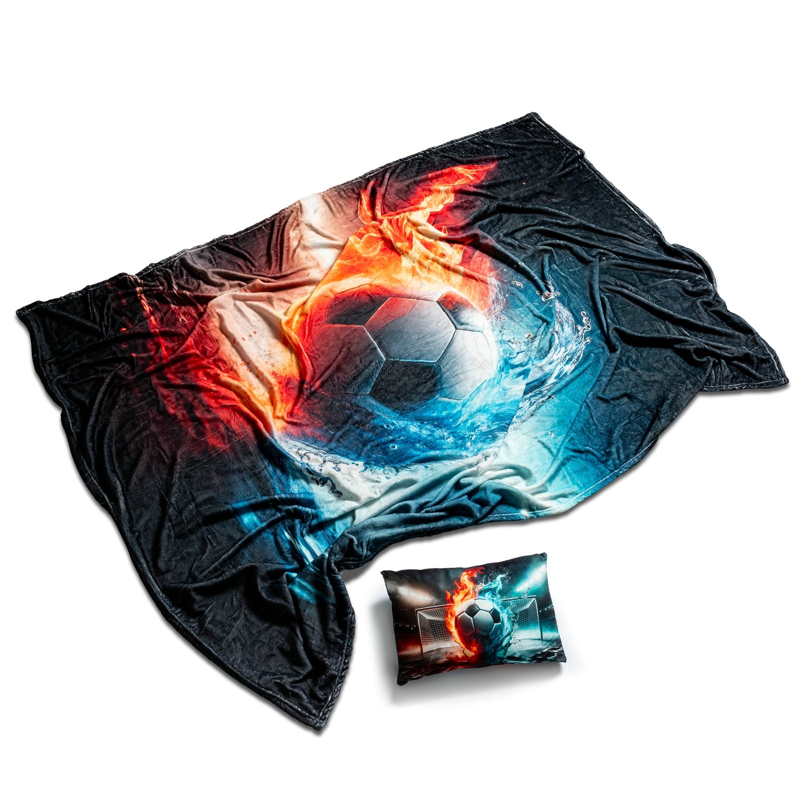 Komplekts īstiem futbola faniem! Šī unikālā kolekcija ir obligāta ikvienam futbola entuziastam! Komplektā ietilpst: mīksta un mājīga sega, kas ir ideāli piemērota spēļu vakariem, rotāta ar dinamisku futbola bumbas apdruku, ko ieskauj uguns un ūdens elementi. Stilīgs spilvens, kas ne tikai izceļ jūsu aizraušanos ar futbolu, bet arī nodrošina komfortu relaksācijas laikā. Apdruka valdzina ar savām košajām krāsām un enerģisko dizainu, simbolizējot kaisli, dinamismu un sporta garu. Lieliska dāvana jebkuram futbola fanam vai lielisks papildinājums jūsu mājas fanu zonai. Ļaujieties izcilam komfortam un ienesiet futbola atmosfēru savās mājās! Produkta informācija: mājīgs komplekts visiem futbola cienītājiem. Komplektā ietilpst sega un spilvens ar dinamiskiem un pievilcīgiem apdrukām. Segas izmēri: 200 x 160 cm un spilvena izmēri: 40 x 25 x 8 cm. Segas materiāls: poliesters un spilvena materiāls: gluds plīšs. Lieliska dāvana futbola entuziastiem!