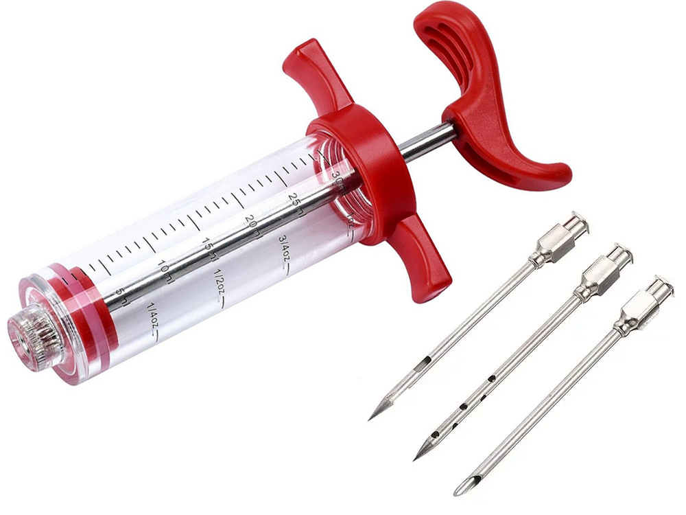 Gaļas injekcijas šļirce gaļas sālīšanai, 30 ml marinādēm. Šļirce gaļas injicēšanai un sālīšanai ir neaizstājams aksesuārs virtuvē ikvienam, kurš vēlas uzlabot savu ēdienu garšu. Tā ir ideāli piemērota gaļas sagatavošanai grilēšanai, mājputnu, liellopu, cūkgaļas vai tītara gaļas cepšanai. Ar šo ierīci jūs varat precīzi ievadīt marinādi, garšvielas vai sālījumu dziļi gaļā, nodrošinot vienmērīgu garšu un izcilu sulīgumu. - Izvēlieties pareizo adatu marinādes veidam un pievienojiet to šļircei. - Piepildiet šļirci ar marinādi, sālījumu vai garšvielām. - Ievadiet marinādi dziļi gaļā, vienmērīgi to sadalot visā gaļā. - Pēc lietošanas izjauciet šļirci, rūpīgi nomazgājiet visas daļas un ļaujiet nožūt. Ar injicēšanas un sālīšanas šļirci jūsu ēdieni iegūs jaunu garšas dimensiju. Ideāls instruments ikvienam pavāram - gan amatierim, gan profesionālim. Adatas iekļautas: - adata ar vienu lielu caurumu galā - paredzēta biezākām marinādēm un mērcēm ar piedevām, piemēram, garšaugiem vai smalki sagrieztām garšvielām. Precīza marināžu ievadīšana, neriskējot aizsērēt adatu. - Adata ar vairākiem sānu caurumiem - īpaši izstrādāta šķidro marināžu un sālījumu vienmērīgai sadalīšanai gaļā. Pateicoties caurumiem visā adatas garumā, marināde tiek ievadīta plašā laukumā, nodrošinot perfektu mērcēšanu. - Adata ar plānu galu - paredzēta maziem gaļas gabaliņiem, piemēram, vistas krūtiņai vai filejai. Precīza marinādes ievadīšana grūti sasniedzamās vietās, nebojājot gaļas struktūru. Tehniskās specifikācijas: - Materiāls: plastmasa, nerūsējošais tērauds - · Kopējais garums ar adatu: - Tilpums: - Graduācija ml, unces Pieejamās krāsas: Tā kā preces ir iepakotas nejauši no ražotāja puses, tās tiek piegādātas dažādās krāsās. Krāsu izvēle nav iespējama. - Sarkans - Melns Komplektā ietilpst: - Gaļas šļirce