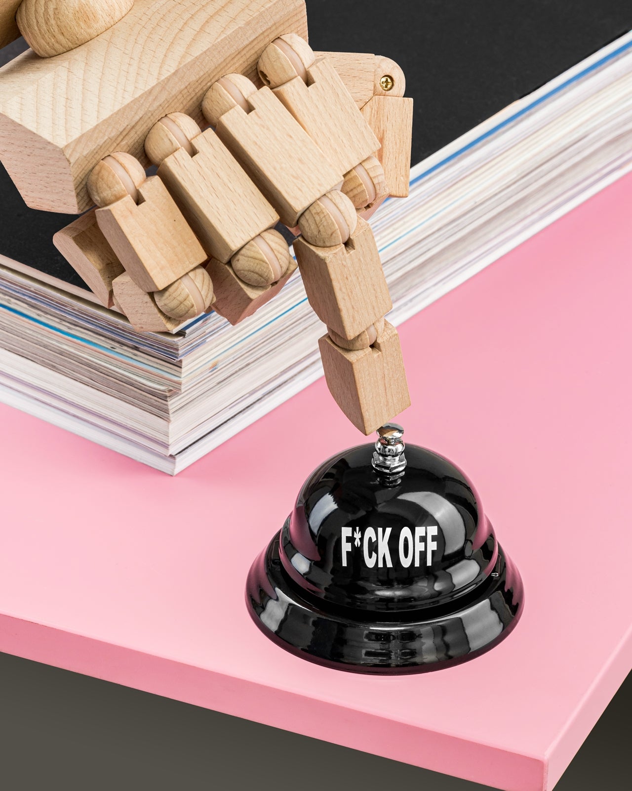 "Ir dienas, kad es saku "pietiek!" Dators nesadarbojas, priekšnieks bez iemesla dusmojas, draugs atkal tevi pieviļ, un benzīntankā kārtējais sūkņa darbības traucējums ;) Reizēm gribētos nolaist tvaiku, bet bieži tas neder, jo piemēram, bērni klausās utt. Tādos brīžos nekas cits neatliek, kā pastiepties pēc mūsu zvana un zvanīt tam, līdz jūtat atvieglojumu, lai gan tas ir bez vārdiem, lai visa pasaule zinātu, ko jūs par visu domājat. šis :) Zvans brīnišķīgi strādā birojā un mājās, palīdzot rūpēties par lietotāja garīgo veselību, radot citiem iespaidu, ka ar tik pieklājīgu cilvēku, kurš nekad nelamājas, sen nav bijis galā ;) Tas uzlabo attiecības un uztur valodas tīrību :) Tas atrod pielietojumu visos platuma grādos. " Funkcijas: - metāla galda zvans ar tekstu F*CK OFF - ja jums tas ir nepieciešams, vienkārši zvaniet, lai atbrīvotu emocijas un spriedzi - lieliska dāvana saspringtā laikā. cilvēki - melnā krāsā ar balto tekstu - ieteikusi Tīras valodas padome ;) - ekoloģisks iepakojums