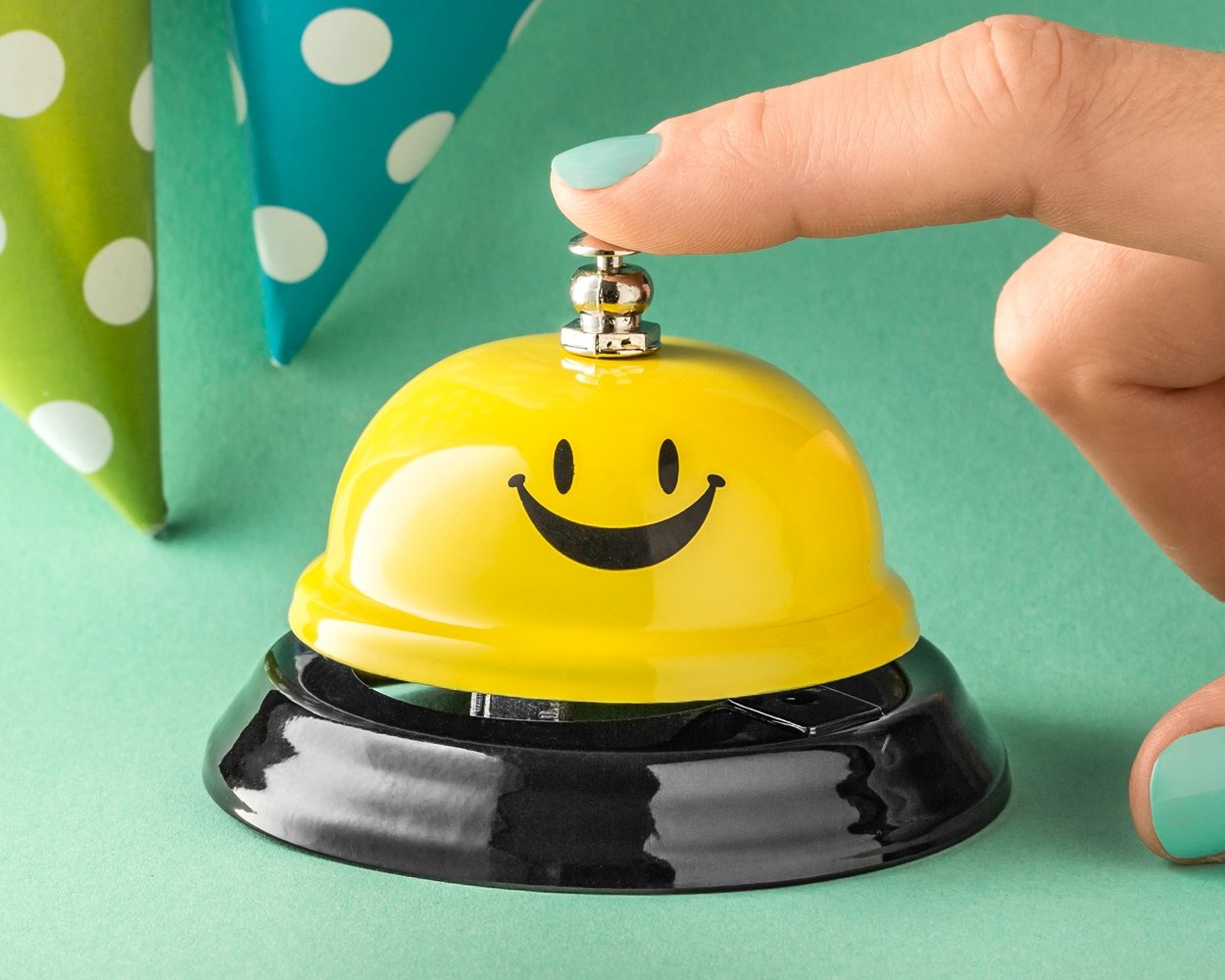 Ding Ding !Gredzenu SMILE var turēt pie dīvāna, pie darba galda vai jebkurā vietā, kur vēlaties piezvanīt apkārtējiem cilvēkiem, lai turpinātu smaidīt. Smaidīšana padara mūsu dzīvi vieglāku un labāku, atbrīvo no stresa, paaugstina garastāvokli, pat var uzlabot imūnsistēmu un pazemināt asinsspiedienu :) Tāpēc esiet pozitīvi un zvaniet par visiem šiem ieguvumiem! Un atcerieties, ka smaidīšana ir lipīga Funkcijas: - metāla galda gredzens SMILE - apdruka uz gredzena: smaidoša seja - ja jums tas ir nepieciešams, vienkārši zvaniet un turpiniet smaidīt - jaukā pozitīvi dzeltenā krāsā - jauns bezvadu sakaru veids - jauka ekoloģiska dāvanu kastīte
