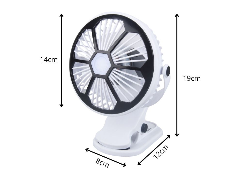 Galda ventilators ar stāvošu klipša ventilatoru un apgaismojumu, 3 uzlādējami režīmi