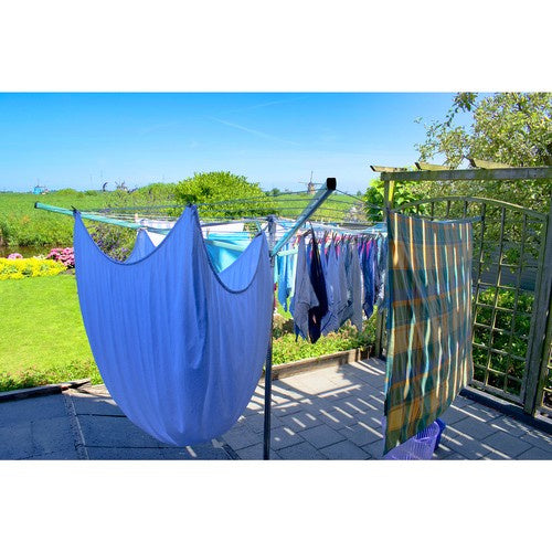 Liels salokāms dārza žāvētājs 50 m virve + enkurs ārējam veļas žāvētājam - ārā žāvētai veļai ir ne tikai patīkama smarža, bet arī īss žāvēšanas laiks. Dārza žāvētājs lieliski piemērots gan lieliem, gan maziem veļas gabaliem. Plašais auklu atstatums, uz kurām veļa tiek pakārta, ļauj tai žūt ātrāk. Pateicoties tā dizainam un atbalsta sistēmām, tas ir ideāls risinājums ikvienai mājsaimniecībai. Montēšanai betonā vai zemē - žāvētāja stabilitāti nodrošina stiprinājums, kas izgatavots no izturīgas ABS plastmasas, ko var uzstādīt betonā vai tieši zemē. Turklāt zemes stiprinājuma sistēma ir ieskrūvēta, kas atvieglo žāvētāja uzstādīšanu un noņemšanu. 48 auklas uz 4 svirām dod 50 m auklu - žāvētājs ir aprīkots ar 48 izturīgām auklām, kas ir izvietotas uz 4 svirām. Katra svira veido trīsstūrveida moduli ar 12 auklām. Kopumā jums ir 50 m auklas žāvēšanai. Žāvētāja sviras, salokot, nofiksējas uz vadotnes, kas pasargā žāvētāju no spontānas salocīšanās. Šāds žāvētājs ir ideāls risinājums gan lieliem, gan maziem veļas gabaliem. Konstrukcija nodrošina ne tikai lielu ietilpību, bet arī stabilitāti un vienmērīgu veļas sadali. Žāvētāja maksimālā slodze ir 40 kg. Ar augstuma regulēšanu – pateicoties iespējai regulēt pārsega augstumu ar auklām, žāvētājs pielāgojas jūsu vajadzībām, nodrošinot lietošanas komfortu neatkarīgi no žāvējamās veļas veida un lietotāja auguma. Drošības sistēma nodrošina, ka žāvētāja pārsegs paliek izvēlētajā augstumā, novēršot tā nejaušu nokrišanu. Žāvētāja pārsega augstuma stabilizēšana palielina tā funkcionalitāti. Specifikācija – krāsa: sudraba; materiāls: alumīnijs, PVC, stieple, ABS, tērauds; roku skaits: 4; salokāms: jā; uzstādīšana: zemē vai betonā; auklu līmeņu skaits: 12; slodzes izturība: maks. 40 kg; virves garums: 50 m; virves atstatums: 11,5 cm; augstuma regulēšana: 195 - 218 cm; izmēri: 178 x 178 x 195 - 218 cm; svars: 2,4 kg; svars iepakojumā: 3,018 kg. Žāvētāja specifikācijas: krāsa: sudraba Materiāls: alumīnijs, PVC, stieple, ABS, tērauds Roku skaits: 4 Salokāms: jā Uzstādīšana: zemē vai betonā Auklas līmeņu skaits: 12 Kravnesība: maks. 40 kg Virves garums: 50 m Attālums starp līnijām: 11,5 cm Augstuma regulēšana: 195 - 218 cm Izmēri: 178 x 178 x 195 - 218 cm Svars: 2,4 kg Svars iepakojumā: 3,018 kg Komplektā iekļauts: žāvētāja enkura stienis ieskrūvēšanai zemē. Dārza žāvētājs ir lieliski piemērots jebkuram dārzam, pagalmam vai terasei. Tā funkcionalitāte un lielā ietilpība padara to neaizstājamu ģimenēm, kuras novērtē ērtības un efektivitāti, žāvējot veļu ārā. Brīdinājums: - montāžu drīkst veikt tikai pieaugušie - pārliecinieties, vai žāvētājs ir stabili piestiprināts - žāvētājs jāuzstāda uz līdzenas virsmas - nepārsniedziet žāvētāja maksimālo slodzi - sargājiet žāvētāju no spēcīgiem vējiem - regulāri tīriet žāvētāju un uzraugiet tā tehnisko stāvokli