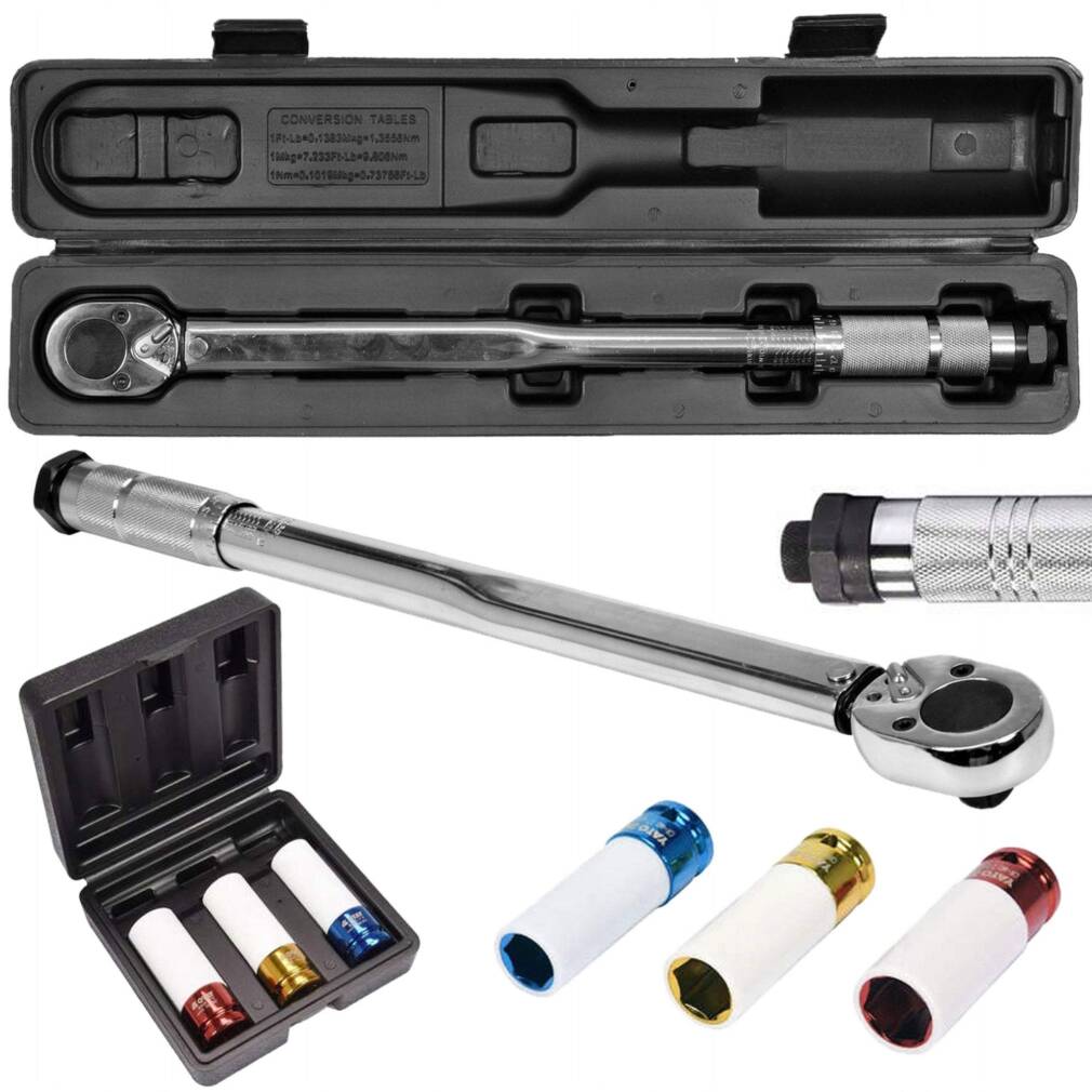 Komplektā ietilpst 1/2 griezes momenta atslēga un 3 hromētu ligzdu komplekts: 17 MM, 19 MM, 21 MM. Šis komplekts ir uzticams un būtisks instruments dažādiem lietojumiem, pateicoties tā profesionālajai konstrukcijai un precīzai griezes momenta regulēšanas iespējām.