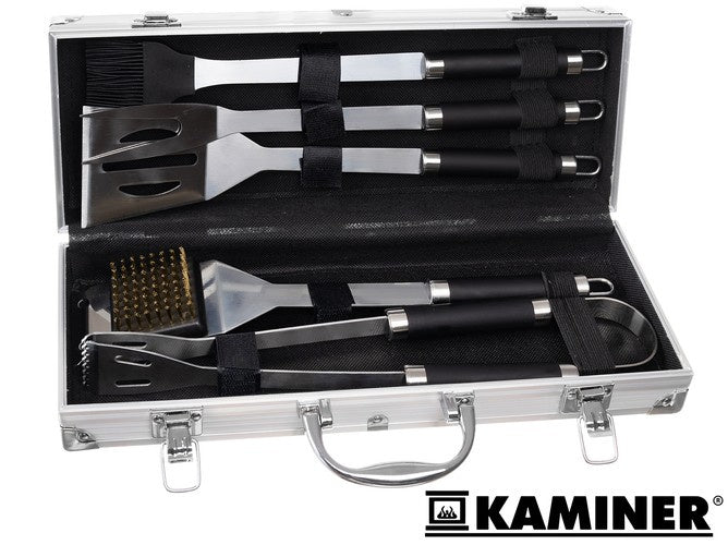 Grila aprīkojums izturīgā alumīnija koferī – grila komplekts ir iepakots ļoti izturīgā koferī, kas izgatavots no alumīnija. Tam ir ergonomisks rokturis, kas nodrošina ērtu pārnēsāšanu un transportēšanu. To var viegli paņemt līdzi pie draugiem vai ceļojumā. Iekļauti 5 piederumi – grila piederumu komplektā ir viss nepieciešamais gan amatieru, gan profesionālai grilēšanai. Komplektā ietilpst dakšiņa, lāpstiņa, birste un knaibles, kā arī grila tīrīšanas birste. Izturīgs un ilgmūžīgs – grila piederumi ir izgatavoti no augstas kvalitātes nerūsējošā tērauda, kas ir izturīgs un noturīgs pret augstām temperatūrām, un vienlaikus viegli tīrāms. Tāpēc šāds komplekts kalpos ilgāk. Universāls – grila piederumi, pretēji šķietamajam, noderēs ne tikai grilēšanai. Pēc grila sezonas beigām tos var izmantot kūpināšanai, cepšanai un ēdiena gatavošanai virtuvē. Specifikācija – materiāls: nerūsējošais tērauds, citi: pp + dakšas materiāls: nerūsējošais tērauds, citi: pp + birstes materiāls: nerūsējošais tērauds, citi: pp + silikons + knaibles materiāls: nerūsējošais tērauds, citi: pp + birstes materiāls: nerūsējošais tērauds, citi: pp + varš + koferis; ārējais materiāls: alumīnijs, citi: dzelzs; iekšējais materiāls: poliesters + neilons; galda piederumu izmēri: birste (G): 35 x 4,5 cm; dakša (G): 35 x 3 cm; lāpstiņa (G): 35 x 8 cm; birste (G): 35 x 6 cm; knaibles (G): 35 x 4,5 cm; kofera izmēri: 374 cm; svars: 1,189 kg. Produkta specifikācija: materiāls: nerūsējošais tērauds, citi: PP + dakša; materiāls: nerūsējošais tērauds, citi: PP + birste; materiāls: nerūsējošais tērauds, citi: PP + silikons + pincete; materiāls: nerūsējošais tērauds, citi: PP + birste; materiāls: nerūsējošais tērauds, citi: PP + varš + korpuss; ārējais materiāls: alumīnijs, citi: dzelzs; iekšējais materiāls: poliesters + neilons; galda piederumu izmēri: birste (garums/platums): 35 x 4,5 cm; dakša (garums/platums): 35 x 3 cm; asmens (garums/platums): 35 x 8 cm; birste (garums/platums): 35 x 6 cm; knaibles (garums/platums): 35 x 4,5 cm; čemodāna izmēri: 374 cm; svars: 1189 kg; komplektā dakša, plecu birste, knaibles, grila tīrīšanas birste, koferis, čemodāns. Augstas kvalitātes grila piederumi padara darbu uz sakarsēta grila un grilētu ēdienu gatavošanu vienkāršāku un patīkamāku. Grila piederumu komplektā ietilpst 5 noderīgi elementi: dakša, lāpstiņa, birste un knaibles, kā arī grila tīrīšanas birste. Viss ir ievietots izturīgā koferī. Šādus grila piederumus var veiksmīgi izmantot arī virtuvē, piemēram, cepšanai. Brīdinājuma saturs: - Piederumu lietošana karsta grila tuvumā var izraisīt apdegumus. Lietojiet instrumentus piesardzīgi. - Lietojiet paredzētajam mērķim. - Grila piederumi, īpaši knaibles, dakšiņas un naži, var būt bīstami bērniem. Turiet komplektu bērniem nepieejamā vietā. - Piederumus nav paredzēts atstāt uz grila vai grilā. Pārmērīga karsēšana var sabojāt rokturus vai samazināt instrumentu izturību. - Lai piederumi būtu labā stāvoklī, mazgājiet tos ar rokām vai saskaņā ar instrukcijām. - Pirms ievietošanas kastē pārliecinieties, vai piederumi ir tīri un sausi, lai novērstu rūsēšanu.