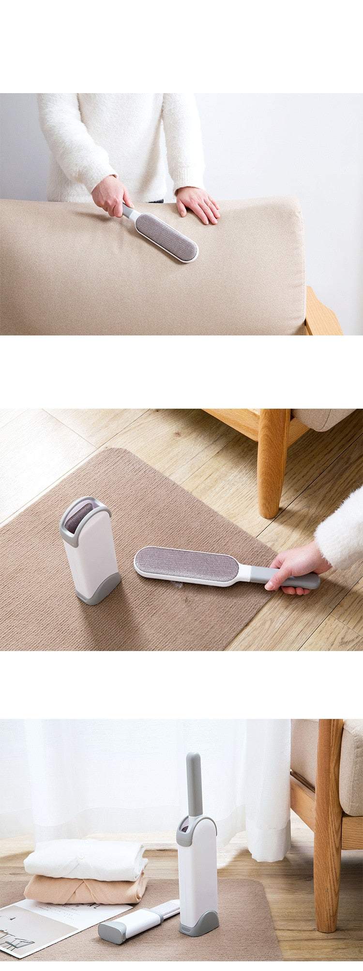 Neslīdošais un nodilumizturīgais rokturis ļauj to ērti turēt un pagriezt. Divvirzienu poliestera zīda mīksti mati, labs adsorbcijas spēks, elektrostatiskās adsorbcijas princips ātri noņem matus no visām virsmām.