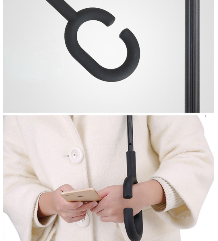 C formas rokturis ļauj izmantot viedtālruni brīvroku režīmā, kamēr lietussargs atspiežas pret ķermeni.