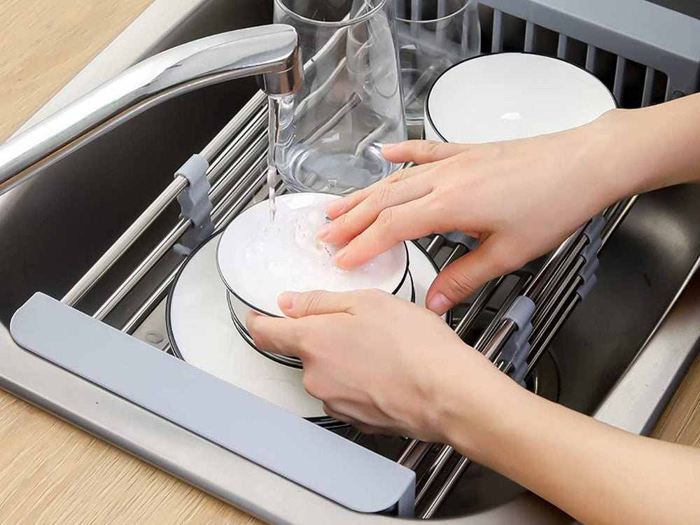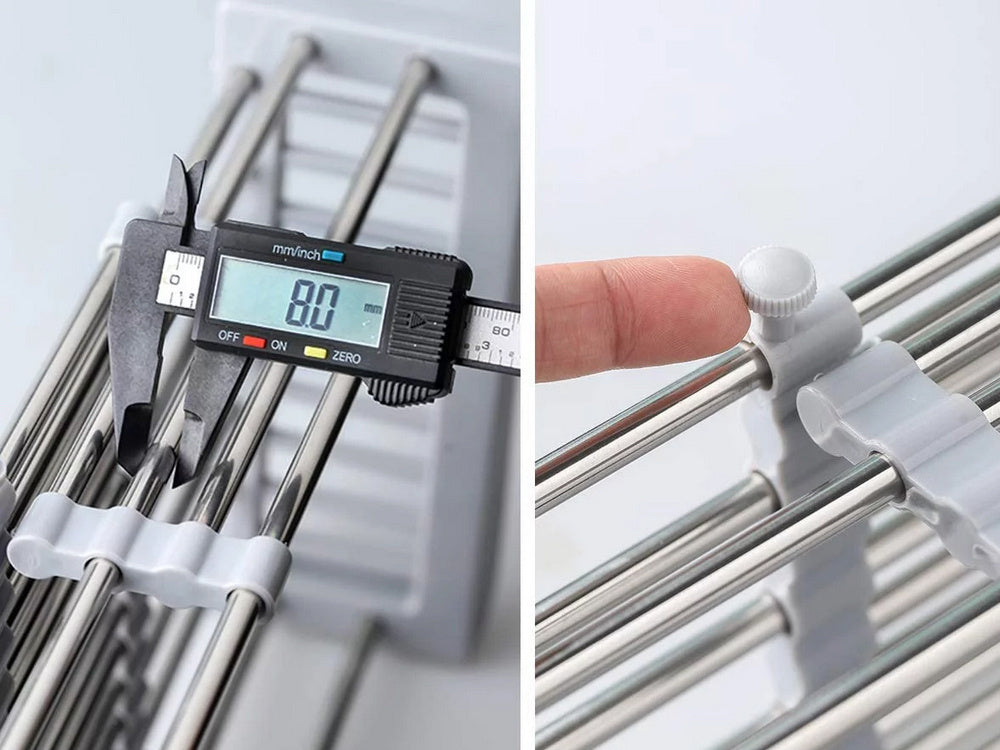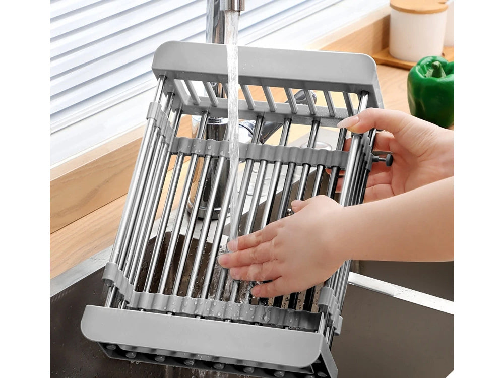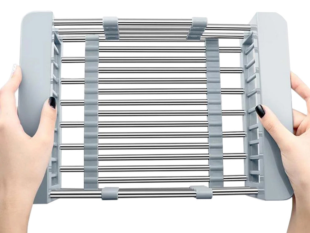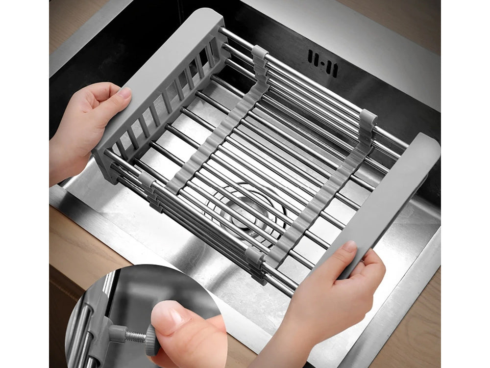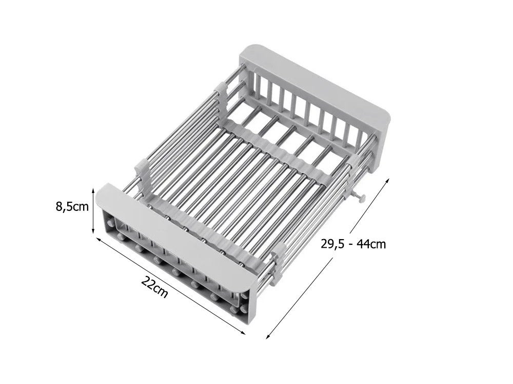 Izlietnes teleskopiskais trauku žāvētājs augļu un dārzeņu grozam. Universālais teleskopiskais žāvētājs ir ideāls risinājums tiem, kas novērtē kārtību, vietas taupīšanu un ērtības virtuvē. Ierīcei ir plašs pielietojumu klāsts, to var izmantot dārzeņu un augļu žāvēšanai vai mazgāšanai, trauku žāvēšanai, gaļas atkausēšanai. Teleskopiskais dizains ļauj to pielāgot vēlamajam izlietnes izmēram. Grozs ir regulējams no 29,5 cm līdz 44 cm. Žāvētājs ar savu ergonomisko dizainu ļauj efektīvi žāvēt traukus, galda piederumus un citus virtuves piederumus, vienlaikus optimizējot darba virsmas vietu. Pateicoties teleskopiskajam dizainam, tas apvieno funkcionalitāti un eleganci, atvieglojot ikdienas virtuves darbus un rūpējoties par virtuves interjera estētiku. Tehniskās specifikācijas: - izgatavots no augstas kvalitātes materiāliem - palielina darba vietu virtuvē - viegli tīrāms - atvieglo trauku žāvēšanu - teleskopisks - regulējams platumā - daudzpusīgs un praktisks - izmēri: - krāsa: pelēka. Komplektā ietilpst: - žāvētājs