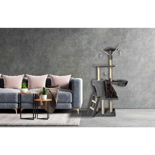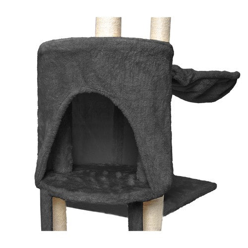 Kaķu koks 138 cm inovatīva stiprinājuma sistēma – mūsu kokam ir papildu sienas stiprinājums, kas padara to drošu un daudz stabilāku nekā konkurentiem. Tagad jūsu kaķis var droši iekārtoties uz augstākās guļus platformas, nosnausties un sapņot par nākamajiem piedzīvojumiem, neuztraucoties par koka apgāšanos. Izpildījums – skrāpējamais stabs ir izgatavots no augu izcelsmes sizala virves, kas ražota no agaves šķiedras. Tas ir ekoloģisks, tāpēc drošs mūsu mājdzīvniekiem. Visu papildina ar mīkstu kažokādu pārklāta pamatne. Skrāpējamais stabs ar 5 līmeņiem – skrāpējamais stabs koka formā ir 138 cm augsts, sadalīts 5 līmeņos, pa kuriem kaķis var brīvi pārvietoties un laiskoties, kā arī slēpties un spēlēties ar citiem kaķiem. Izturīgā konstrukcija ar plato pamatni nodrošina skrāpējamā staba stabilitāti. Koka galvenā priekšrocība ir mājīga mājiņa, kurai var piekļūt pa diviem pakāpieniem. Kaķēns varēs brīvi atpūsties. Uz koka ir trīs pūkainas peles, kas stimulē kaķa zinātkāri un mudina kaķi spēlēties vai medīt. Tās tika uzstādītas koka 4. stāvā. Universāls izskats — skrāpējamais stabs izceļas ar modernu un mājīgu dizainu, pateicoties kuram tas labi izskatīsies jebkurā telpā. Kaķu koks lieliski iederēsies jebkurā mājas interjerā — neatkarīgi no stila vai aksesuāriem. Specifikācija — krāsa: pelēka, materiāls: MDF plāksne + adīta mākslīgā kažokāda + papīra caurule + sizala virve; izmēri (augstums x platums): 138x55 cm; svars: 9,2 kg. Specifikācija — krāsa: pelēka, materiāls: MDF plāksne + adīta mākslīgā kažokāda + papīra caurule + sizala virve; maksimālā slodze: 18 kg; svars: 9,2 kg; pamata izmēri: augstums: 138 cm; platums: 55 cm; pamatne: 49 cm x 35 cm; stabu diametrs: 6,0 cm; augšējās platformas diametrs: 26,5 cm; līmeņu skaits: 5; materiāli: sizala virve, mīksts plīšs; aprīkojums: ? 1 x mājiņas; ?1 x kāpnes; ?3 x piekaramas rotaļlietas; ?1 x novērošanas klājs augstākajā līmenī; stabi, pārklāti ar sizala virvi; ?1 x atpūtas krēsls. Montāžas komplekts — ideālas mājas jūsu kaķēnam! Asināšanas stabs var kalpot kā rotaļlieta vai gulta. Izgatavots no drošiem materiāliem. Caurules ir ietītas sizala virvē, un apdare ir mīksta un izturīga. Turklāt, pateicoties stiprinājumam pie sienas, tas ir ļoti stabils un pilnīgi drošs jūsu mājdzīvniekiem. Brīdinājuma saturs: - pārliecinieties, ka koks ir stabili novietots uz līdzenas virsmas, lai tas neapgāztos, kamēr jūsu kaķis spēlējas. - pareizi salieciet visas sastāvdaļas saskaņā ar instrukcijām. - regulāri pārbaudiet koka stāvokli, īpaši stiprinājumus un skrāpējamās virsmas. Nodiluma gadījumā nomainiet bojātās detaļas. - ievērojiet koka maksimālo lietotāja svaru, lai izvairītos no konstrukcijas pārslodzes. - novietojiet koku tālāk no logiem, durvīm un kāpnēm, lai izvairītos no kritieniem vai nejaušiem apkārtnes bojājumiem. - uzraugiet savu kaķi, izmantojot skrāpēšanas stabu.