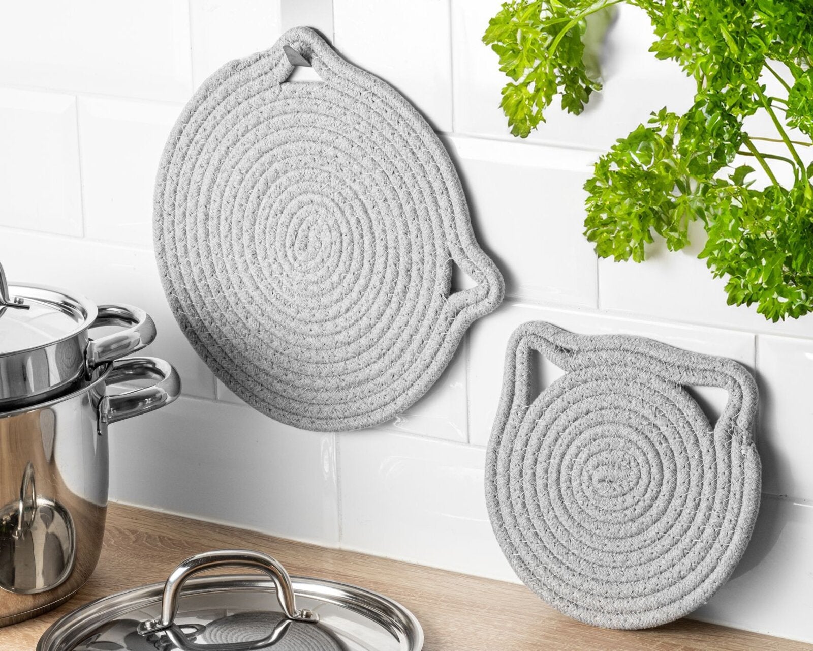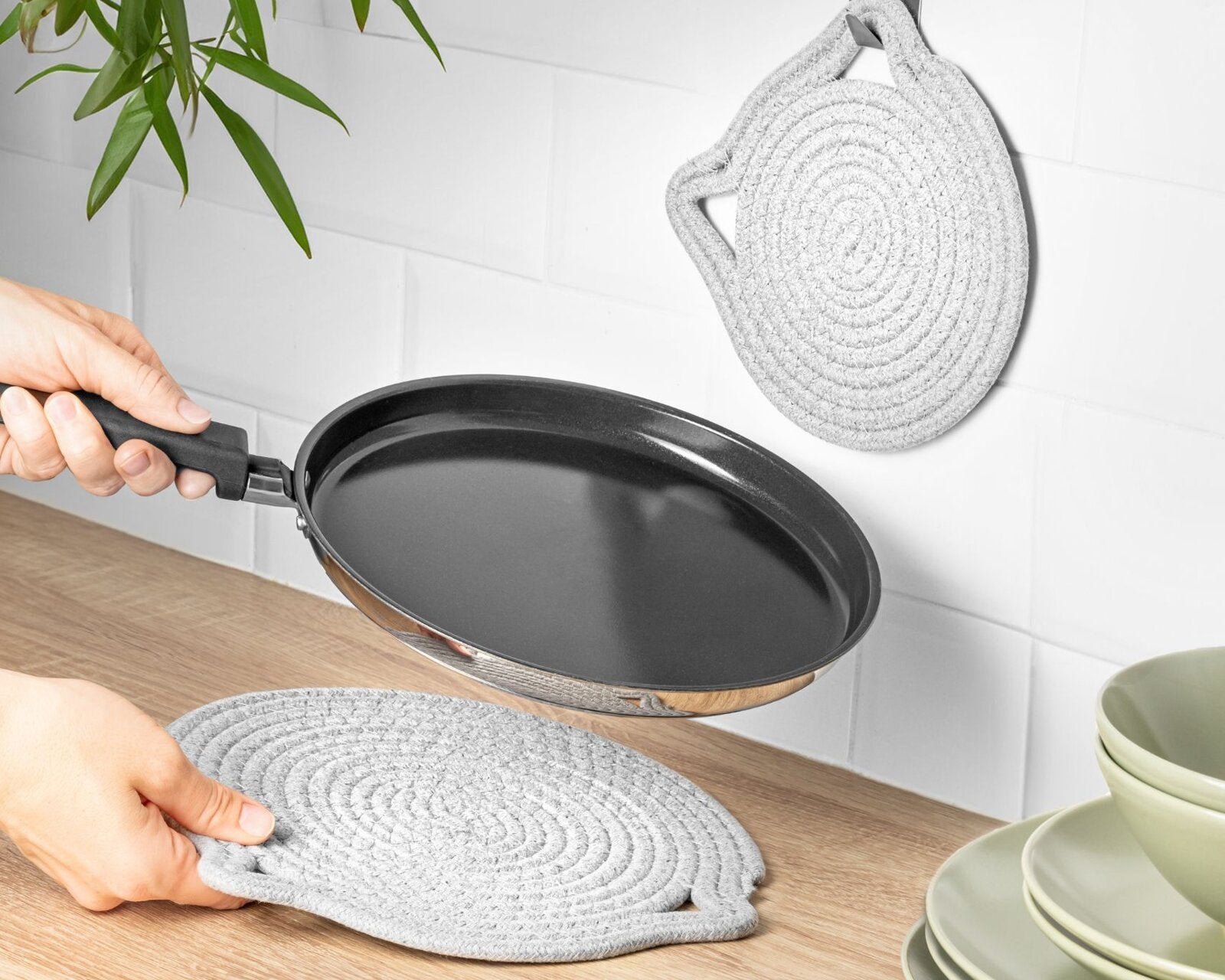 Praktiski un uzmanību piesaistoši kaķa galvas formas paliktņi/paliktņi karstiem katliem, pannām vai cepšanas veidnēm. Šie burvīgie paliktņi noteikti noderēs virtuvē un ir lieliski piemēroti, lai aizsargātu jūsu darba virsmas, virtuves virsmas un galdautus no bojājumiem, ko rada augsta temperatūra. Izgatavoti no izturīgas, karstumizturīgas austas kokvilnas ar izteiktām kaķa ausīm, tie atradīs īpašu vietu kaķu mīļotāju virtuvēs, lai gan tie ir tikpat noderīgi ikvienam :) Īpašības: 2 burvīgi kaķa ausu formas paklājiņi/paliktņi karstiem ēdieniem efektīvi aizsargā jūsu darba virsmas, virtuves virsmas un galdautus lielāks paliktņa diametrs: 25,5 cm, mazāks paliktņa diametrs: 19,5 cm biezums: 0,5 cm kaķa ausi var izmantot paliktņa pakarināšanai. Izgatavoti no izturīgas, karstumizturīgas austas kokvilnas. Praktiska un burvīga dāvana ne tikai kaķu mīļotājiem.