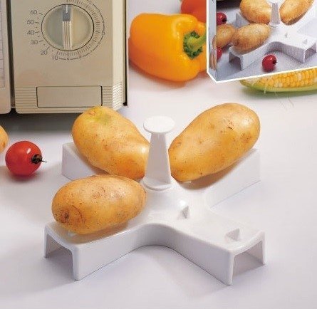 Viegls veids un laika taupīšana, lai pagatavotu jakas kartupeļus. Funkcijas: - ātrs un vienkāršs veids, kā pagatavot jakas kartupeļus. - Drošs mikroviļņu krāsnī - mazgājams trauku mašīnā Instrukcijas: 1. Pirms lietošanas nomazgājiet. 2. Vienu reizi stingri uzlieciet kartupeļus uz smailēm, apgrieziet kartupeļus un vēlreiz saduriet. - 3. Pirms ievietošanas mikroviļņu krāsnī nostipriniet kartupeļus uz plaukta.4. Ievietojiet mikroviļņu krāsnī un gatavojiet ar pilnu jaudu, regulāri pārbaudot, caurdurot ar dakšiņu, līdz tas ir mīksts un mīksts. 5. Tā kā visām mikroviļņu krāsnīm ir dažāda jauda, gatavošanas laiks var atšķirties, bet četriem vidēja lieluma kartupeļiem ļauj 12-15 minūtes. 6. Pirms pasniegšanas ļaujiet nostāvēties 30 sekundes. Uzmanību: 1. Nav piemērots lietošanai zem tieša siltuma avota, piemēram, mikroviļņu griliem, konvekcijas mikroviļņiem vai parastajām krāsnīm. 2. Mikroviļņu krāsnī var sakarst, izņemot pārtiku, izmantojiet roku aizsarglīdzekļus. 3. Pārtika ar augstu tauku, eļļas vai cukura saturu var izraisīt krāsas maiņu, tas neietekmēs veiktspēju.