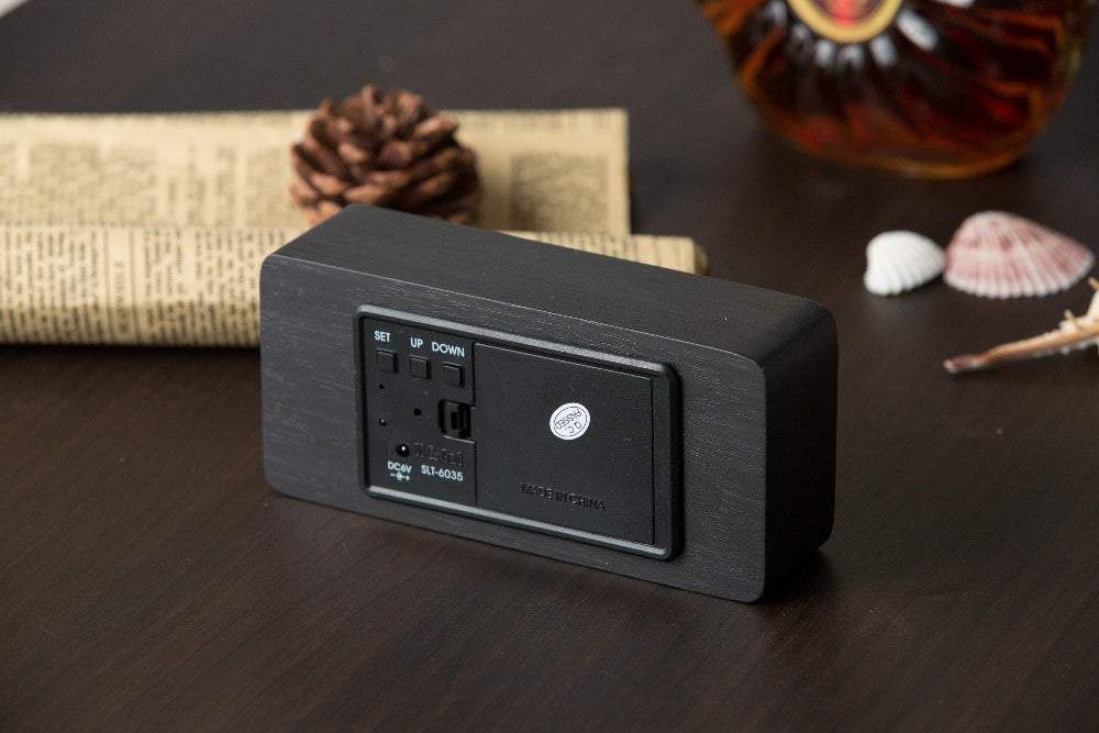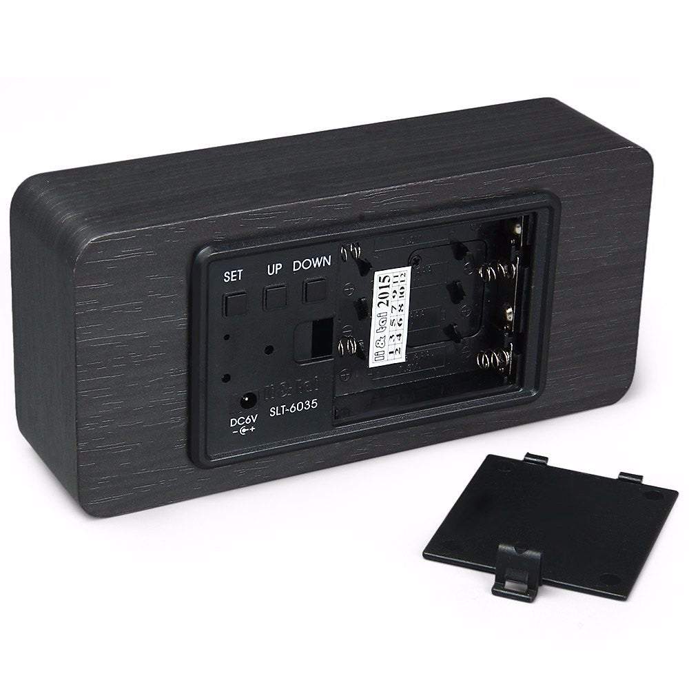 Moderns koka LED pulkstenis ar modinātāju un termometru, tumšā krāsā