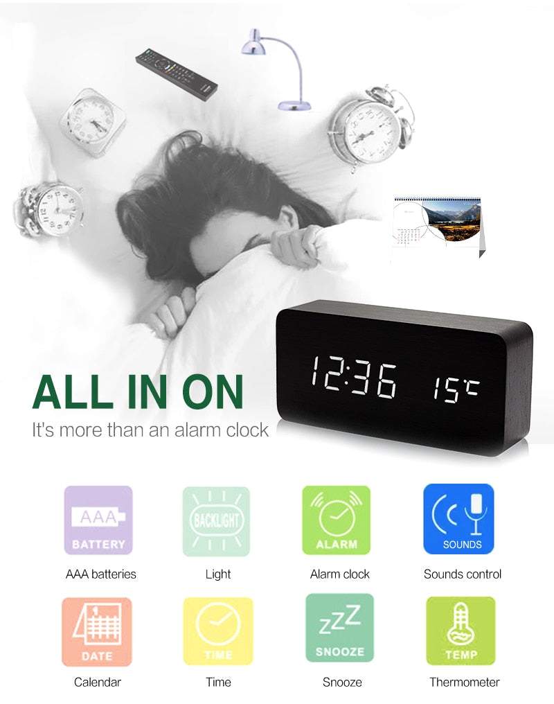 Mūsdienīgs LED pulkstenis, kas aprīkots ar modinātāju, kalendāru, termometru un USB kabeli.