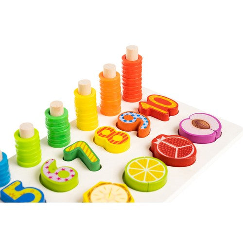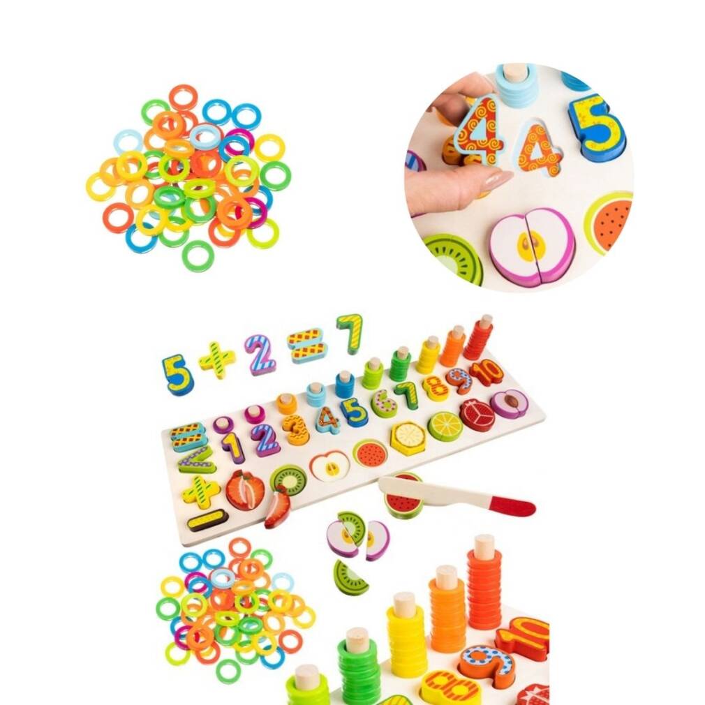 * Komplektā ietilpst 10 cipari un 8 augļi (pusītes savienotas ar magnētu), koka