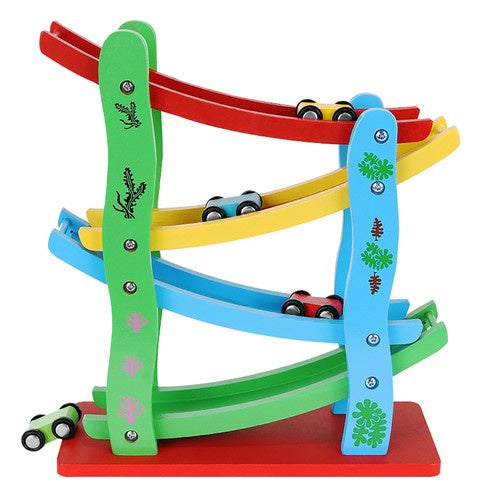 Koka slidkalniņš - mašīnīšu trase, 5 elementi komplektā - rotaļlieta sastāv no 5 elementiem: slidkalniņš ar 4 sliedēm un 4 mašīnītēm (zaļa, zila, sarkana un dzeltena). Viss ir izgatavots no koka un krāsots ar bērniem nekaitīgu krāsu. Tā ir droša un ekoloģiska alternatīva rotaļlietām, kas izgatavotas no plastmasas. Izgatavotas no koka - koka rotaļlietas ir mūžīgs piedāvājums, kas iepriecinās ikvienu mazuli. Koka klasiskais skaistums un izturība nozīmē, ka tas vienmēr ir baudījis lielu atzinību. Šis izejmateriāls labi izskatās gan dabiskajā krāsā, gan krāsots. Drošs veselībai - tā kā slidkalniņš ir izgatavots no koka, tas ir drošs ikvienam bērnam. Dabīgais materiāls nozīmē, ka pat ja bērns paņem rotaļlietu pie mutes, viņš nesaskarsies ar mākslīgiem materiāliem. Tam nav izvirzītu, asu elementu, kas varētu savainot bērnu. Attīstība - koka slidkalniņš lieliski pilda izglītojošo lomu. Tas attīsta sīko motoriku un roku prasmes. Jūsu bērns iemācīsies atpazīt krāsas un skaitīt līdz 4, kā arī uzzinās par cēloņsakarībām, palaižot mašīnītes uz trases. Specifikācija - materiāls: koks; Slidkalniņa izmēri: 24,5 x 10 x 28 cm; komplekta svars: 630 g; svars ar iepakojumu: 790 g. Specifikācija Materiāls: koks Slidkalniņa izmēri: 24,5 x 10 x 28 cm Komplekta svars: 630 g Svars ar iepakojumu: 790 g Iekļauts slidkalniņš 4 vagoniņi Slidkalniņam ar vagoniņām ir 4 līmeņi, un līdz ar to 4 sacīkšu trases, katra citā krāsā. Novietojot vagoniņu uz augstākās trases, bērns var vērot, kā tas nolaižas līdz pašai apakšai. Rotaļlieta ir konstruēta tā, lai bērns varētu vienlaikus palaist 4 transportlīdzekļus vienu pēc otra. Spēles laikā bērns apbrīnos vagoniņu ātrumu un akrobātiku, tiem braucot lejā. Brīdinājuma saturs: - brīdinājums. Nav piemērots bērniem, kas jaunāki par 36 mēnešiem. Sīkas detaļas. Aizrīšanās risks. - Produkti nav piemēroti lietošanai pārtikā. - Nepakļaujiet skarbajiem laikapstākļiem un ugunij. - Lietojiet paredzētajam mērķim. - Neignorējiet ieteikumus attiecībā uz lietotāja vecumu. - Nelietojiet bojātu produktu. - Montāžai nepieciešams pieaugušais. - neglabājiet nesaliktas detaļas vietās, kur tām var piekļūt bērni. - iepakojums nav rotaļlieta. Rotaļlietu jāizsaiņo pieaugušajam, un iepakojums un tā daļas jānoņem bērniem nepieejamā vietā.