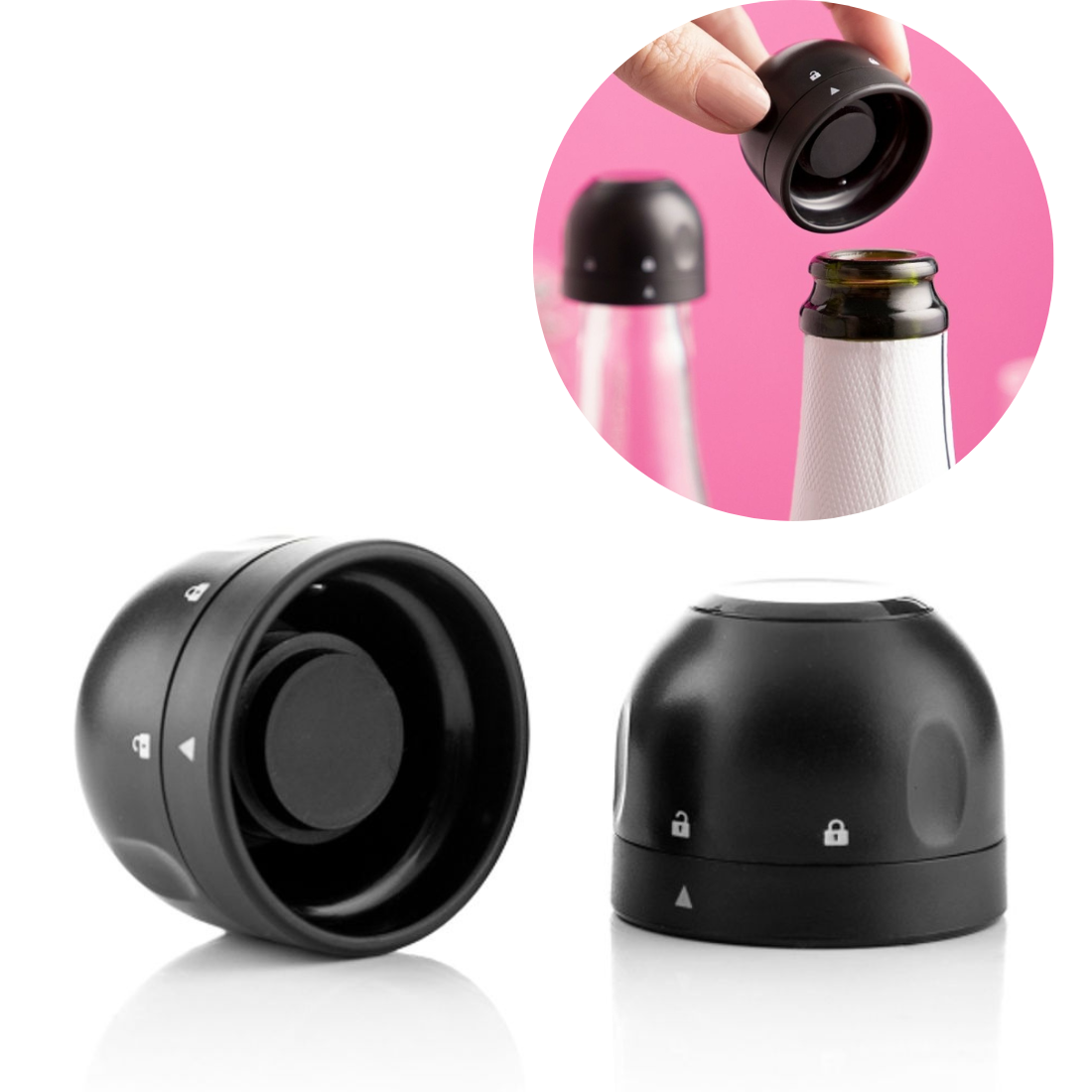 Divu modernu un elegantu šampanieša pudeļu aizbāžņu komplekts, kas ļauj hermētiski aiztaisīt pudeles. Vieglā noslēgšanas sistēma ilgāk saglabā pudeles saturu dzirkstošu, it kā tā būtu tikko atvērta. Korķi ir ļoti viegli lietojami. Vispirms pagrieziet korķi, līdz bultiņa saskaras ar atvērtas piekaramās slēdzenes simbolu, un pēc tam pilnībā ievietojiet aizbāzni pudeles kaklā. Lai aktivizētu blīvējuma slēdzeni, vienkārši pagrieziet to tā, lai bultiņa atbilstu aizvērtās piekaramās slēdzenes simbolam. Lai noņemtu aizbāzni, atkal pagrieziet to atvērtas piekaramās atslēgas simbola virzienā. Šis oriģinālais aizbāznis ir paredzēts dzirkstošajiem dzērieniem un šampanieša, cava un prosecco tipa pudeļu kakliņiem (17,5-18 mm). Blīvējuma slēdzene nedarbojas vīna pudelēm vai citām pudelēm ar kakliņiem, kas atšķiras no tiem, kam tas ir paredzēts, lai gan to var izmantot arī kā parastu hermētisku aizbāzni citām pudelēm. Tas ir arī ergonomisks, jo tam ir dažādas satvēriena zonas un tā forma ir pielāgota pirkstu galiem ērtākai lietošanai. Tas nodrošina stingru turēšanu un novērš pilēšanu un izšļakstīšanos.