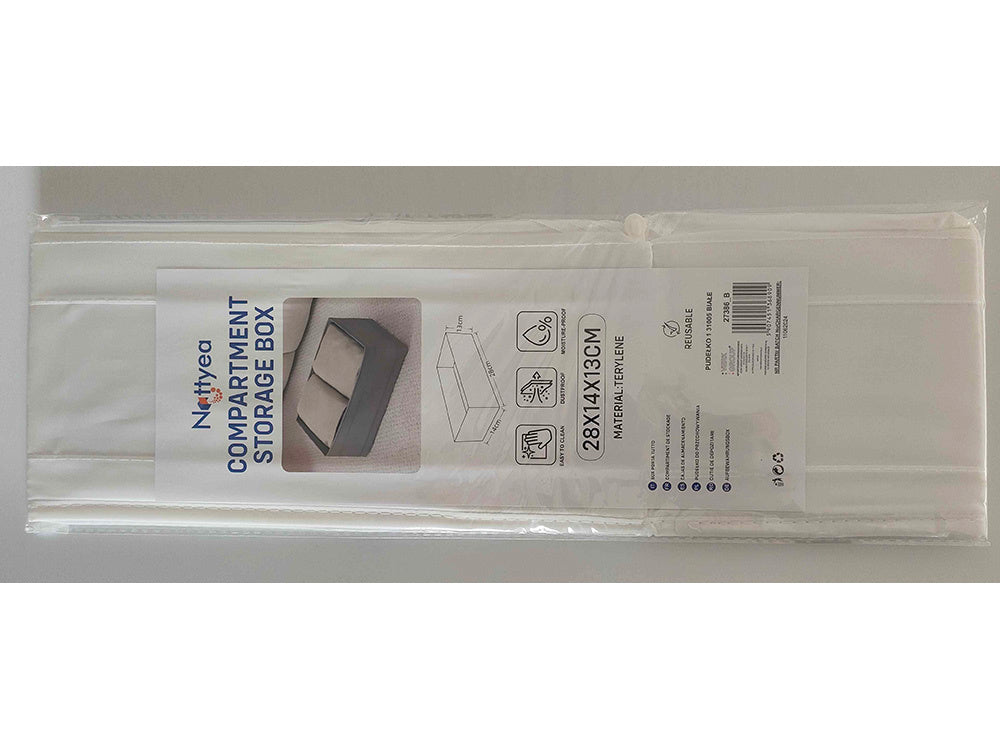 Brain organizer apakšveļas zeķēm drēbju atvilktne, balta, 28x14x13cm? Praktisks krūšturu un apakšveļas organizators - balts, 28x14x13 cm? Šis funkcionālais organizators ir ideāls risinājums tiem, kas vēlas uzturēt kārtību savā garderobē. Ar izmēriem , tas ir ideāli piemērots krūšturu, apakšveļas un citu nelielu apģērba gabalu glabāšanai, palīdzot maksimāli izmantot vietu atvilktnēs un skapjos.? Ideāla telpas organizācija Organizators ir izstrādāts, domājot par efektīvu telpas pārvaldību. Tas ļauj atdalīt apakšveļu, atvieglojot nepieciešamo priekšmetu ātru atrašanu un kārtības uzturēšanu garderobē. Tas ir ideāli piemērots lietošanai atvilktnēs, plauktos vai skapjos, nodrošinot labāku organizāciju un estētisku uzglabāšanu.? Izturīgs un viegli tīrāms, izgatavots no augstas kvalitātes materiāla, organizators ir izturīgs pret bojājumiem un viegli tīrāms. Tā baltā krāsa piešķir eleganci un iederas lielākajā daļā interjeru, ienesot svaigumu un kārtīgumu jūsu garderobē.? Funkcionāls dizains, pateicoties tā pārdomātajam dizainam, organizators ir viegli lietojams un to var brīvi pielāgot dažādām telpām. Tā vieglā konstrukcija ļauj to viegli pārvietot un pārkārtot pēc nepieciešamības. Tas ir neaizstājams aprīkojums ikvienam, kurš novērtē kārtību un funkcionalitāti veļas uzglabāšanā. - tehniskās specifikācijas: ✔ produkta kods: ✔ viegli tīrāms ✔ organizatora malas pastiprinātas ar kartonu ✔ plašs pielietojuma klāsts ✔ ideāli piemērots apakšveļai ✔ organizatora izmēri: ✔ materiāls: poliesters ? Komplektā ietilpst: - organizators - folijas iepakojums