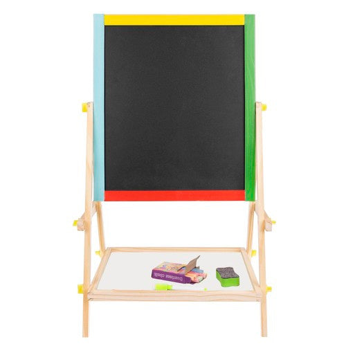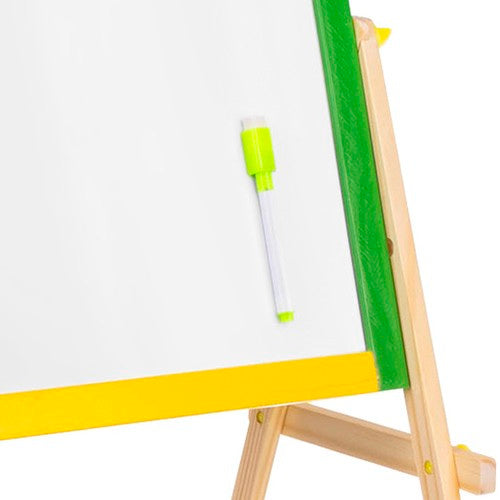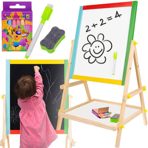 Divpusēja koka tāfele bērniem? 2 lietošanas iespējas - tāfeli var uzstādīt 2 veidos. To var pagriezt pret bērnu ar krīta tāfeli vai sausās dzēšanas tāfeli. Komplektā ietilpst tauriņskrūves, kas ļaus ērti mainīt pozīciju. ? Koka rāmis - daudzfunkcionālās izglītojošās tāfeles rāmis ir pilnībā izgatavots no koka. Katra daļa ir nokrāsota ar atšķirīgu krāsu - dzeltenu, zaļu, zilu un sarkanu. Viss ir perfekti pulēts un drošs bērniem. ? Izklaide un mācīšana - izglītojošā tāfele stimulē iztēli un radošumu, kā arī attīsta manuālās prasmes pašos pašos. Lieliska jautrība nekad nebeidzas. Tāfele ne tikai izklaidē, bet arī māca pacietību un attīsta koncentrēšanās spējas. Tā ir lieliska dāvanas ideja katram bērnam! ? Praktisks plaukts - zem tā ir plaukts, ko var izmantot, lai uzglabātu krītu vai citas mazas rotaļlietas jūsu bērnam. Tāfeles specifikācija: ?? Materiāls: MDF + dzelzs loksne, rāmis: materiāls: koks, cits: PE, plaukts: MDF + EVA sūklis + krītiņi + marķieris. Izmēri: 65,5 x 40 x 33 cm ?? Komplekta svars: 1,151 kg ?? Svars ar iepakojumu: 1,691 kg Iekļauts: ?? divpusēja tāfele ?? marķieris ?? sūklis ?? krīts Fantastisks komplekts katram bērnam. Izglītojošā tāfele garantē lielisku izklaidi neatkarīgi no dzimuma. Zēniem tas patīk, meitenēm tas patīk - arī vecākiem patīk spēlēties ar saviem bērniem. Daudzfunkcionālā izglītojošā tāfele stimulē iztēli un radošumu, kā arī attīsta pašiem mazākajiem roku prasmes. Lieliska jautrība nekad nebeidzas. Tāfele ne tikai izklaidē, bet arī māca pacietību, attīsta koncentrēšanās spējas un trenē atmiņu. Tā ir lieliska dāvanas ideja katram bērnam! Brīdinājuma saturs: - brīdinājums. Nav piemērots bērniem līdz 36 mēnešu vecumam. Sīkas detaļas. Aizrīšanās risks. - Produkti nav piemēroti lietošanai pārtikā. - Nepakļaujiet skarbajiem laikapstākļiem un ugunij. - Lietojiet paredzētajam mērķim. - Neignorējiet ieteikumus attiecībā uz lietotāja vecumu. - Nelietojiet bojātu produktu. - Montāžai nepieciešams pieaugušais. - Neglabājiet nesaliktas detaļas vietās, kur bērni tām var piekļūt. - Iepakojums nav rotaļlieta. Rotaļlietu jāizsaiņo pieaugušajam, un iepakojums un tā daļas jānoņem bērnam nepieejamā vietā.
