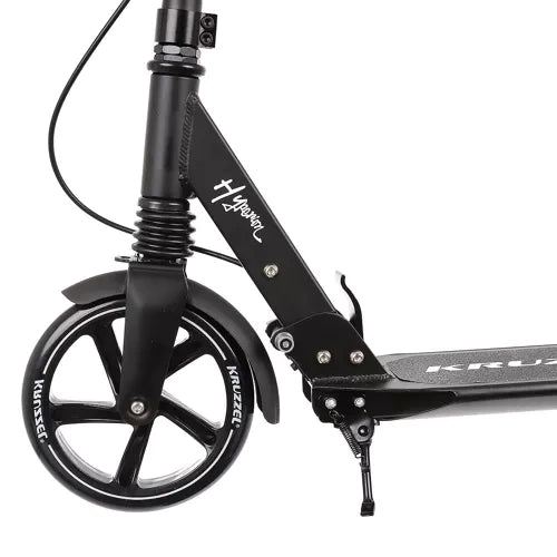 Liels salokāms skrejritenis ar Kruzzel kājiņu? Lieli gumijas riteņi – pateicoties tam, ka skrejritenim ir lieli gumijas riteņi, braukšana ir ērta. Riteņi ir manevrējami un ļoti viegli vadāmi. Transportlīdzeklis ir ārkārtīgi izturīgs, tā maksimālā slodzes diapazons ir no 20 līdz 100 kg, pateicoties tam, tas ir piemērots gan bērniem, gan jauniem, gan veciem. ABEC-9 gultņi – kā zināms, gultnim ir milzīga ietekme uz ātrumu, kādu skrejritenis var sasniegt, kā arī uz braukšanas komfortu. Pateicoties tam, ka skrejritenim ir augstas klases gultņi – ABEC-9, tas nodrošina labāku precizitāti, efektivitāti un spēju sasniegt lielāku ātrumu. Stūres augstuma regulēšana ar klikšķi – skrejritenim ir 3 pakāpju stūres augstuma regulēšana. Lai mainītu augstumu, vienkārši nospiediet pogu un ievietojiet to caurumā, kas atrodas zemāk vai augstāk. Mūsu piedāvātajam skrejritenim ir alumīnija pamatne, tāpēc tas ir viegls – 6,5 kg. Pilsētas salokāms – salokāms pilsētas skrejritenis ir inovatīvs risinājums cilvēkiem, kuri novērtē ātru un ekoloģisku pārvietošanās līdzekli. Izstrādāts, ņemot vērā mobilitāti, nodrošina komfortu, ceļojot pilsētas nostūros. Īpaši praktiskā salocīšanas funkcija padara mūsu skrejriteni viegli pārnēsājamu un uzglabājamu. Salocīšana aizņem tikai dažas minūtes, tāpēc to ir viegli pārnēsāt sabiedriskajā transportā vai uzglabāt nelielās telpās. ? Specifikācija - krāsa: melna; materiāls: alumīnijs + gumija; 2 bremzes: disku un dubļu sargs; riteņi: gumijas; gultņi: ABEC-9; atbalsta kājiņa: jā; atstarotājs: uz aizmugurējā dubļu sarga; riteņa diametrs: 20 cm; izmēri: 97 x 37 x 105 cm; platformas izmēri: 37 x 14 cm; augstuma regulēšana: no 90 līdz 105 cm; svars: 6,5 kg; svars iepakojumā: 7 kg. Specifikācija: krāsa: melna Materiāls: alumīnijs + gumija 2 bremzes: disku un dubļu sargi riteņi: gumija gultņi: abec-9 atbalsta kājiņa: jā atstarotājs: uz aizmugurējā spārna riteņa diametrs: 20 cm izmēri: 97 x 37 x 105 cm platformas izmēri: 37 x 14 cm augstuma regulēšana: no 90 līdz 105 cm svars: 6,5 kg svars iepakojumā: 7 kg. skrejritenis ir ne tikai izklaidei paredzēts transportlīdzeklis, bet arī arvien populārāks, ekoloģisks pārvietošanās līdzeklis. salokāmu skrejriteni var izmantot gan bērni, gan pieaugušie. lielais riteņu diametrs atvieglo braukšanu un papildus ātri attīsta ievērojamu ātrumu. gumijas riteņi padara braukšanu ērtu. tie ir veikli un ļoti viegli vadāmi, garantē labu saķeri un absorbē nelielus nelīdzenumus uz ceļa. skrejritenim ir arī atbalsta kājiņa, kas ļauj to atstāt stāvus stāvoklī. tas ne tikai atvieglo lietošanu, bet arī padara transportlīdzekli mazāk uzņēmīgu pret dažādiem bojājumiem, kas var rasties, ja tas atrodas uz zemes vai atbalstās pret sienām vai citiem priekšmetiem. Skrejriteņa regulējamā stūre garantē tā pielāgošanu lietotāja augumam. Divkārša stūres fiksācija pasargā to no nekontrolētas atslābšanas pat ātri braucot pa nelīdzenām virsmām. Metāla aizbīdņi ļauj regulēt augstumu 3 līmeņos, un ātrās atbrīvošanas stiprinājums droši nostiprina stūri izvēlētajā pozīcijā. Dubļu sargs virs aizmugurējā riteņa kalpo arī kā bremze. Platā galvenā platforma nodrošina drošu un ērtu pozīciju. Tas ietekmē skrejriteņa braukšanas vieglumu, kā arī palielina paātrinājuma efektivitāti, stumjot, kas var būt dinamiskāk, ja otrai kājai ir stabils atbalsts. Skrejriteni ir ļoti viegli salikt. Vienkārši izņemiet to no kastes, ievietojiet rokturus stūrē, ar vienu sviru atlociet visu konstrukciju, un jūs varat nekavējoties sākt braukt. Brīdinājuma saturs: - vienmēr valkājiet aizsarglīdzekļus. - nelietojiet ielu satiksmē. - A klase - produkts ir paredzēts lietotājiem, kuru svars ir 20 kg-100 kg. - ieteicamais lietotāja vecums: +10 gadi. - skrejritenis ir paredzēts lietošanai tikai vienai personai un pieaugušā uzraudzībā. - skrejriteni izmantojiet tikai uz virsmām, kas ir piemērotas šim nolūkam, t.i., līdzenas, tīras un sausas. Kad vien iespējams, izmantojiet skrejriteni tālāk no citiem satiksmes dalībniekiem. Izvairieties no nogāzēm. Iedarbinot skrejriteni, bremzes var sasilt. Piezīme: pēc bremzēšanas nepieskarieties bremzēm, jo tās var būt ļoti karstas. - Vienmēr uzmanieties no citiem. - Jāvalkā šāds drošības aprīkojums: roku balstu, ceļgalu, galvas un elkoņu aizsargi. Lietojot skrejriteni, jāvalkā apavi. - Pirms katras lietošanas reizes pārbaudiet, vai stūres sistēma ir pareizi noregulēta un vai visi savienojošie elementi ir cieši pievilkti. Ir pareizi piestiprināti un nav bojāti. - Braukšanas laikā pārliecinieties, vai kāju balsts ir pareizi salocīts. - Nelietojiet skrejriteni krēslā, naktī vai sliktas redzamības apstākļos. - Izmantojiet skrejriteni tikai bezceļos. Nelietojiet to uz ceļiem, nogāzēm vai kalniem. Izvairieties no uzturēšanās kāpņu un atklātas ūdenstilpnes tuvumā. - Skrejritenis nav piemērots lēkšanai. - Saskaņā ar ceļu satiksmes noteikumiem skrejritenis nav transportlīdzeklis! Tas ir paredzēts lietošanai pa ietvēm.