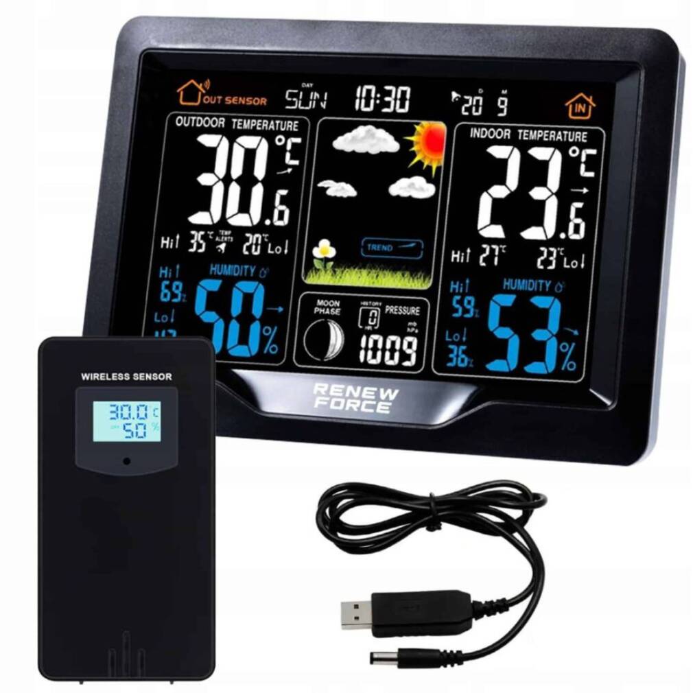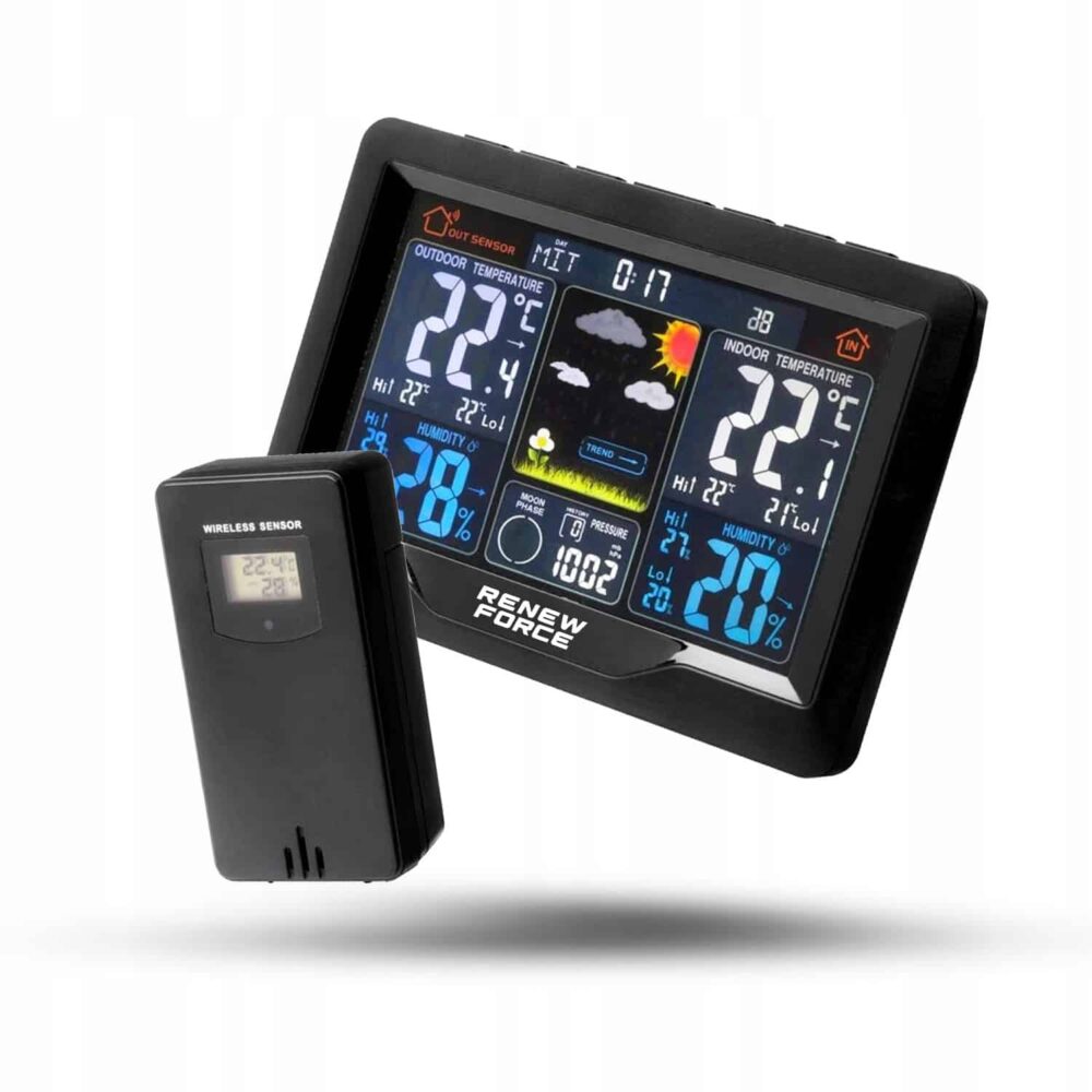rīks, kas mēra temperatūru un mitrumu, parāda datumu un laiku, un tam ir