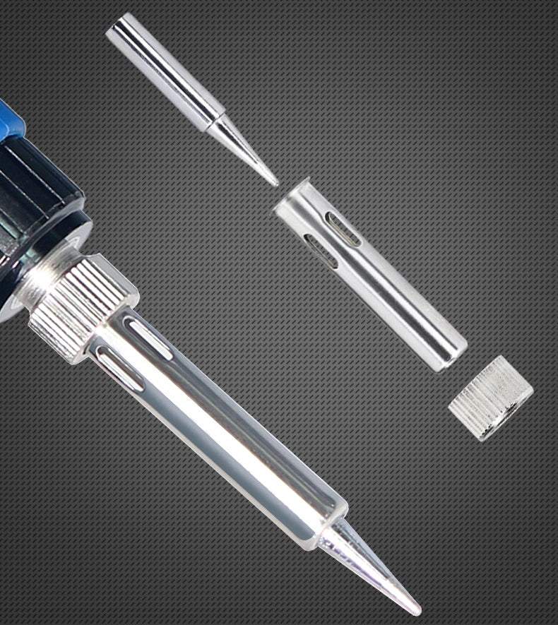 ietilpst 5 maināmi uzgaļi dažādiem lodēšanas uzdevumiem.