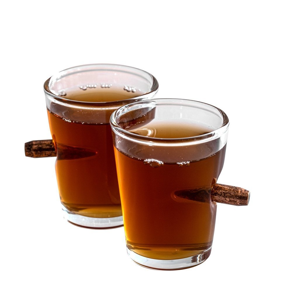 Divās šāvienu glāzēs iestrēgušas divas lodes. Izmēģiniet! Funkcijas: - ar rokām pūstas glāzes ar īstām lodēm - izmēģiniet to, lai redzētu, cik tās ir ļoti vīrišķīgas - izgatavotas no stipra stikla - unikāla dāvanas ideja daudzām ballītēm - stikls nesatur šaujampulveri vai svinu, tāpēc tas ir 100% drošs lietošana - mazgāšana tikai ar rokām, lai lietošana būtu ilgstoša - 100 ml ietilpība katrai nošauto glāzei - stikls tiešām nav ložu necaurlaidīgs, bet izskatās :)