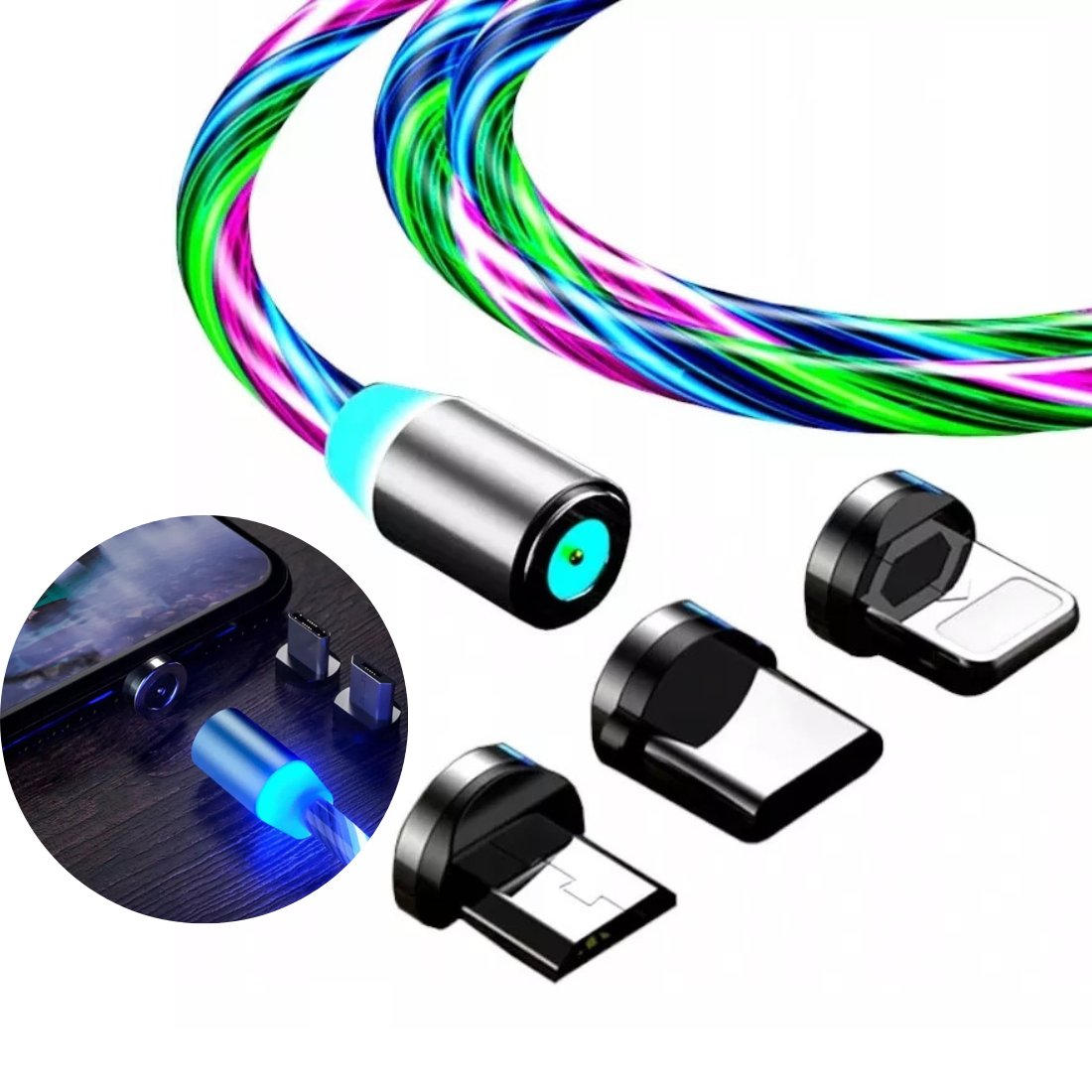 Lādētājs - spīdīgs vads ar magnētiskiem uzgaļiem (Micro USB, type-C, iPhone lightning)